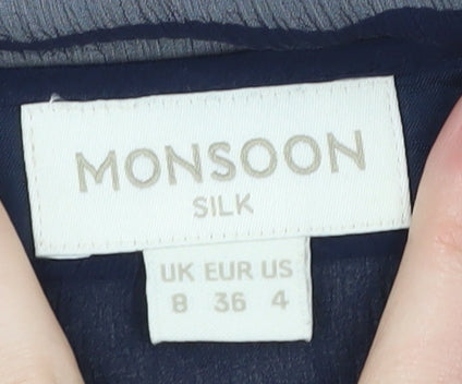 Elevate your wardrobe with this elegant Monsoon shrug, crafted from 100% silk in a sophisticated blue shade that's perfect for both formal gatherings and chic cocktail parties. Designed for women, this shrug is a fantastic layering piece for spring and summer. It features long sleeves, making it ideal for evenings when you need a light cover-up. The absence of patterns ensures a classic and versatile look, easily pairing with a wide range of outfits. Its regular fit makes it suitable for everyday wear or special occasions, while the high-quality silk ensures comfort and a luxurious feel against the skin. This garment is in excellent condition with no visible defects, making it a reliable addition to any collection. Dry clean only to maintain the fabric's integrity. At an attractive price point, this Monsoon silk shrug combines style and affordability, offering timeless elegance that will enhance your fashion ensemble.