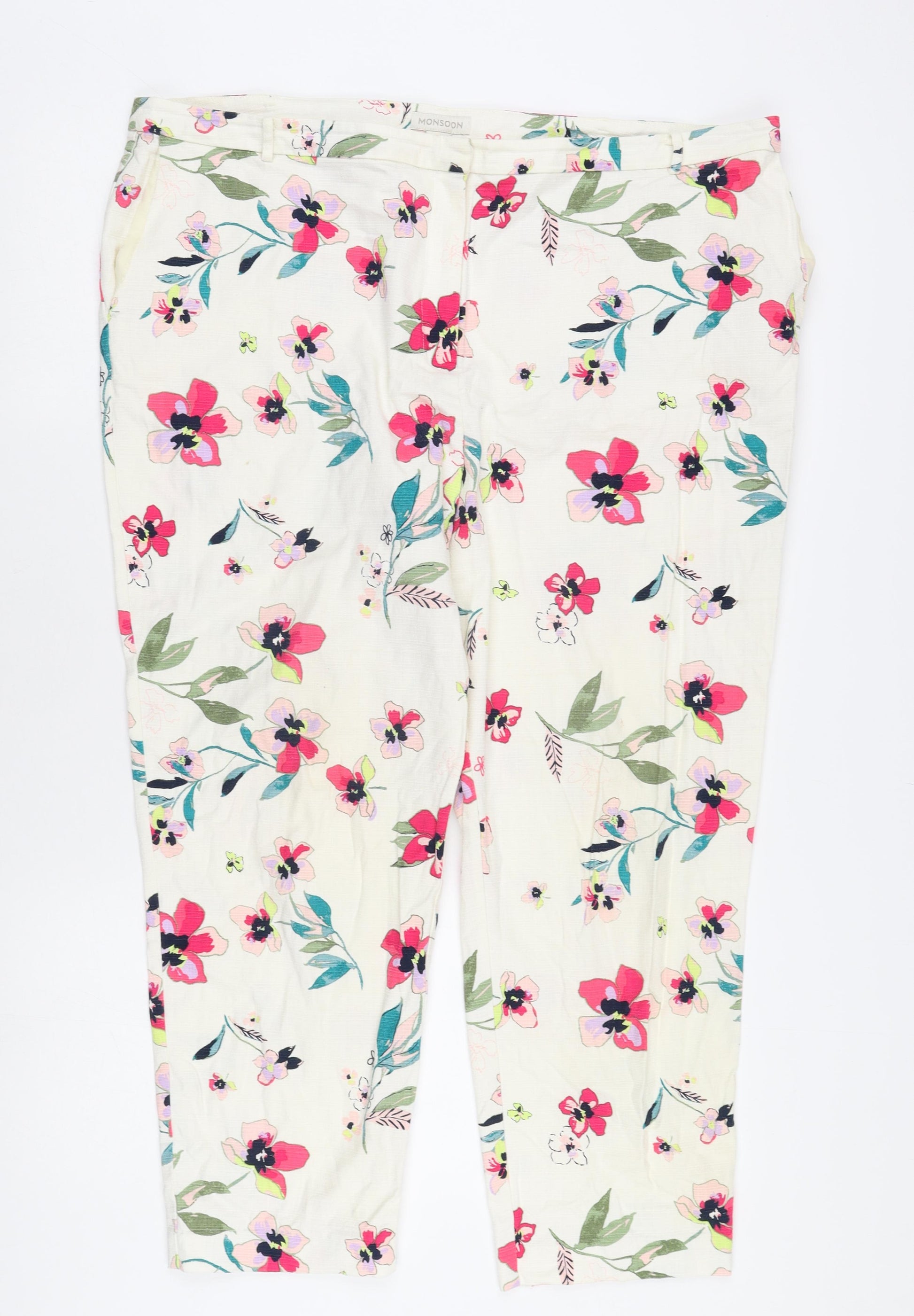 Embrace the vibrant charm of these Monsoon Women's Cropped Trousers, designed to add a splash of colour to your wardrobe. Crafted from a comfortable blend of 98% cotton and 2% elastane, these trousers effortlessly combine style and ease. The playful floral pattern over a multicoloured canvas serves as a perfect pick for casual occasions. Perfectly tailored for women, these trousers fall under the regular size type, complete with an accommodating UK size 20. The cropped style offers a fashionable yet relaxed fit, making these trousers suitable for a myriad of activities. With a casual occasion setting in mind, these trousers provide comfort and versatility. Whether you're heading out for a leisurely day or an informal lunch, these trousers serve as a delightful choice. The floral pattern adds that perfect feminine touch, ensuring you look effortlessly chic. These trousers maintain an excellent condition, free from visible wear or damage, promising longevity and the high quality associated with the Monsoon brand. The design is not only machine washable for convenience but also crafted to be durable. Brighten your look with these charming Monsoon trousers, guaranteed to become a staple in your wardrobe. Pair them with a solid top to let the vibrant patterns stand out or mix and match for a bold style statement. Make these vibrant floral trousers yours and experience the perfect blend of comfort and style.