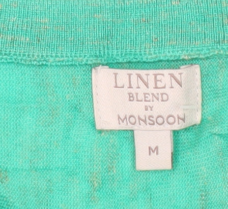 Elevate your wardrobe with this stylish linen blend pullover jumper from Monsoon, perfect for warm spring and summer days. Crafted with a breathable and lightweight knit, it combines casual elegance with comfort. The fabric composition offers a blend of 72% acrylic, 12% linen, 9% nylon, and 7% cotton, ensuring durability while maintaining a soft, airy feel. The relaxed fit and dolman short sleeves make it an easy choice for those who enjoy a loose, comfortable style that still delivers shape and sophistication.This medium-sized jumper features a flattering V-neckline, making it versatile enough to pair with everything from jeans and trousers to skirts for a more effortless look. Its tight-knit construction ensures the fabric sits neatly while retaining shape, complementing its simple, solid green tone which is both vibrant and versatile. With its minimalist design and no pattern, it becomes a staple layering piece that goes with almost anything.Perfect for casual outings, travel, or relaxed weekends at home, this Monsoon jumper is practical yet stylish. The garment is machine washable, making it easy to care for, and the stretch in the blend enhances movement and wearability. Designed to provide both comfort and chic appeal, it's an excellent addition for anyone seeking adaptable wardrobe staples.In very good pre-loved condition, this jumper shows only light signs of wear with faint bobbling, which is hardly noticeable when worn. The Monsoon quality ensures this piece remains dependable and fashionable for many seasons ahead. Whether worn on its own during warmer months or layered under jackets in springtime, this pullover jumper adds an enduring charm to your wardrobe.Add this Monsoon linen blend jumper to your collection today for an easy, timeless piece that blends casual comfort with signature style.