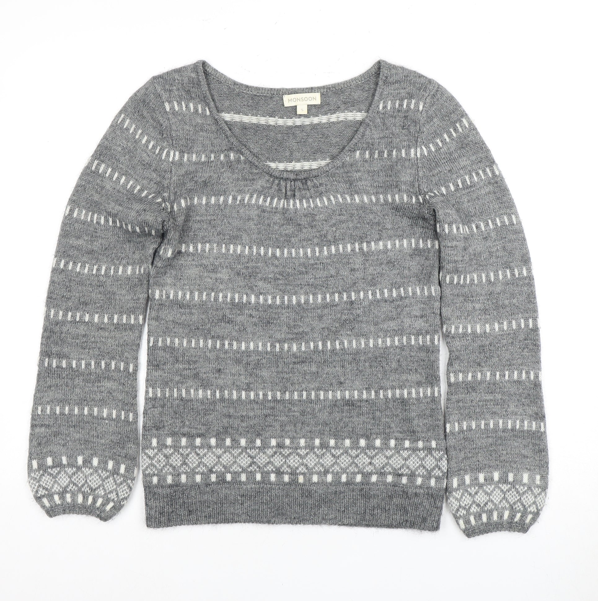 Embrace the cosy charm of winter fashion with this Monsoon Women's Grey Pullover Jumper, perfect for casual occasions and everyday comfort. Crafted in a snug Fair Isle pattern, this jumper combines a classic scoop neckline with long sleeves, making it an ideal choice for chilly days. The exquisite grey hue adds a touch of elegance to the overall design, ensuring it pairs effortlessly with a variety of outfits. Made from a comfortable blend of materials—70% acrylic, 20% wool, and 10% nylon—this knitwear promises warmth and durability throughout the season. Its regular fit and size S tailoring ensure a flattering silhouette for any woman. Though pre-loved, the jumper is in excellent condition, with no visible signs of wear or damage, ready to deliver both style and functionality to your winter wardrobe. Hand wash only to maintain its pristine knit style. Whether you're heading for a casual day out or enjoying a cosy evening at home, this Monsoon jumper is your ideal companion.