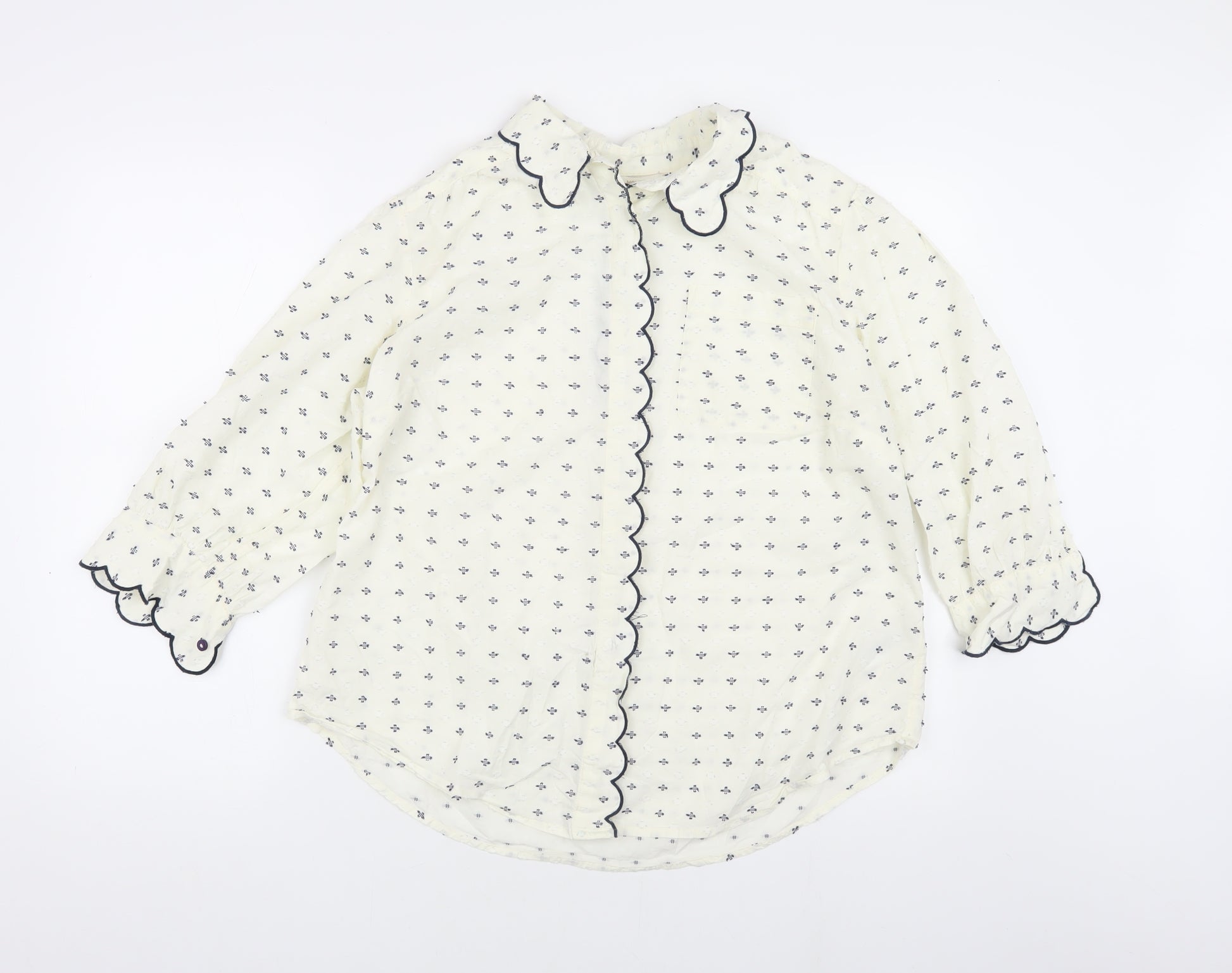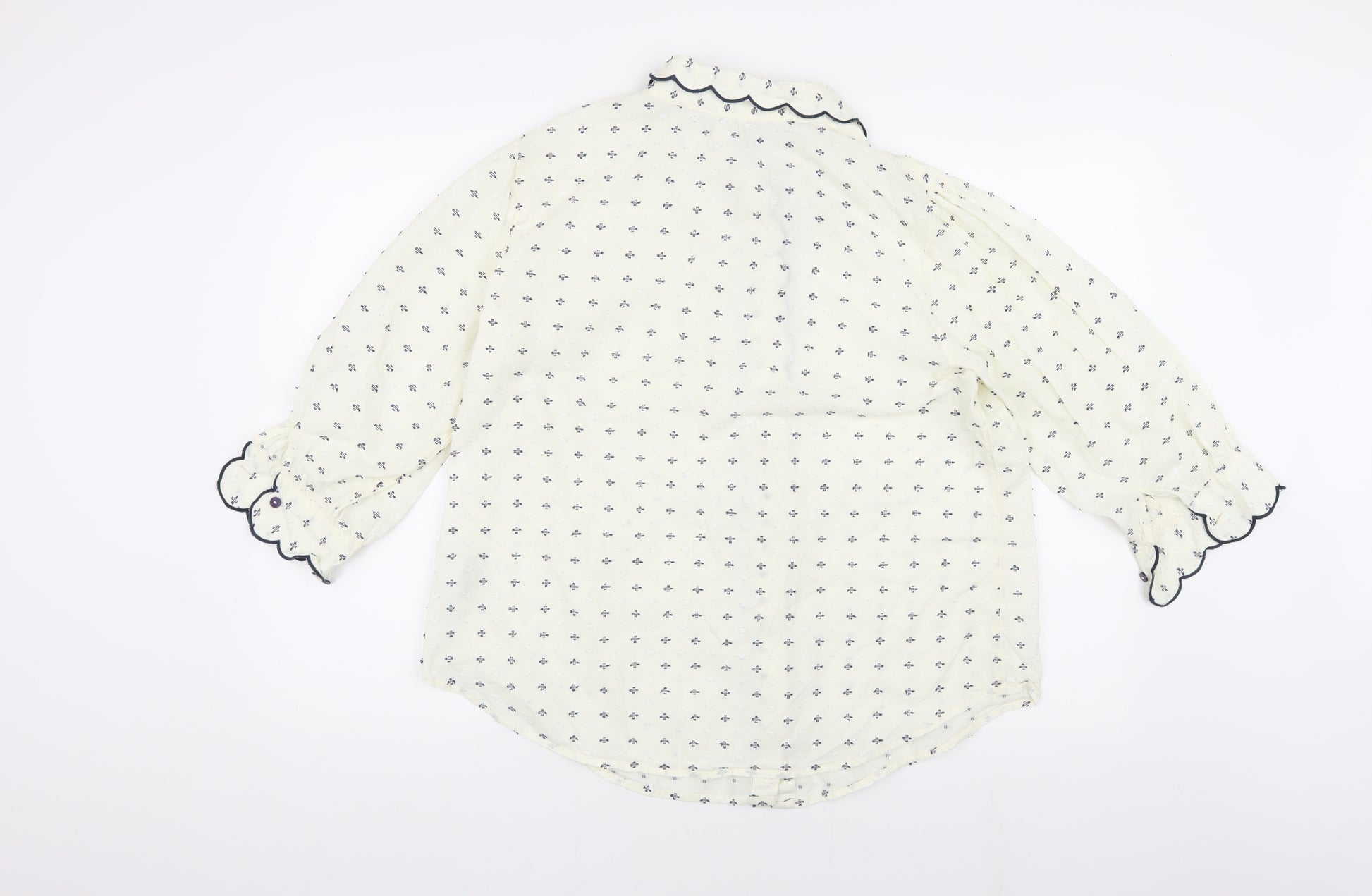 Elevate your wardrobe with this elegant Monsoon blouse, perfect for any casual or office setting. Designed in a versatile size 16, this women's blouse boasts a delicate geometric pattern on an ivory base, exuding a classic charm. The blouse features a stylish collared neckline, complemented by long balloon sleeves for a touch of sophistication. Crafted with a blend of 91% cotton and 9% polyester, the fabric is both breathable and comfortable, ensuring all-day wearability. The blouse's button accents add a subtle yet distinctive detail, while the regular fit ensures a flattering silhouette for any body type. Whether you're attending a laid-back spring brunch or a crisp autumn outing, this blouse transitions effortlessly between seasons. Machine washable for easy care, it promises to be a reliable staple in your collection. Experience the quality and style that Monsoon is known for with this pristine blouse.