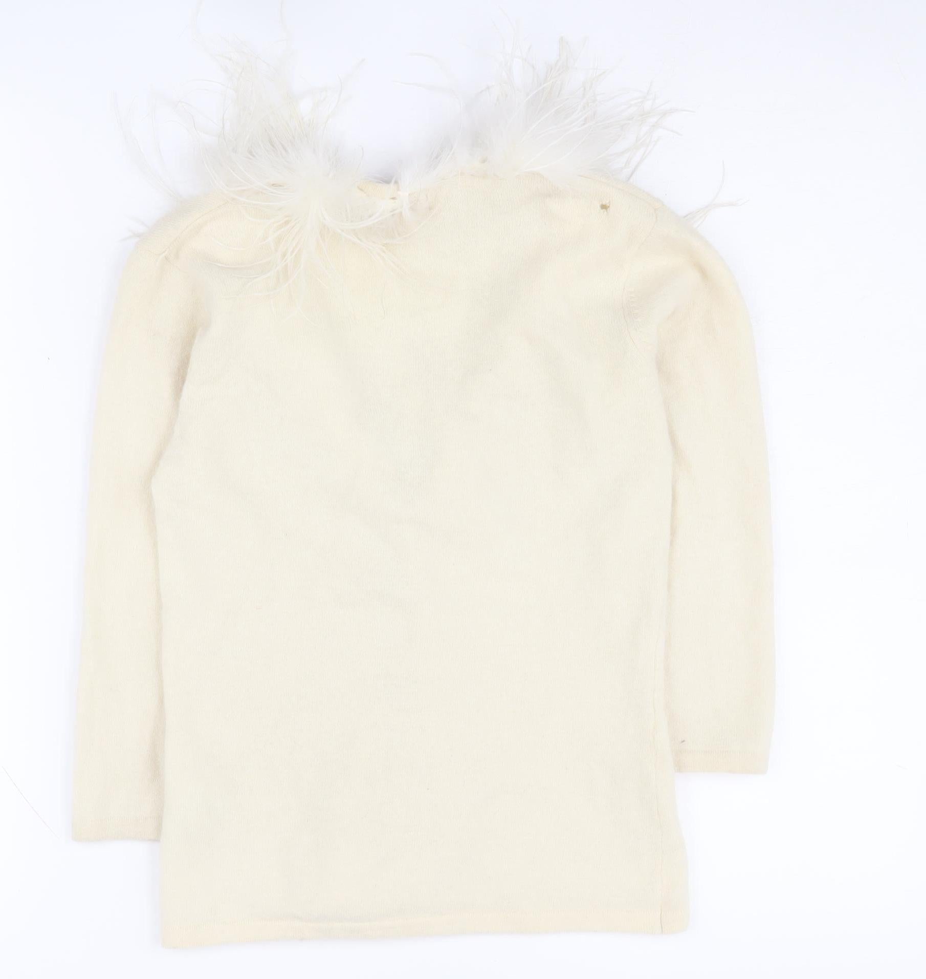 Discover elegance with this Monsoon women's ivory cardigan, perfect for layering throughout the year. Crafted from a luxurious blend of lambswool, angora, and nylon, this soft, tight-knit cardigan promises warmth and comfort. Its standout feature is the charming fur trim detailing, accompanied by a classic button closure for effortless style. Sized at UK 8, this piece is ideal for adding a touch of sophistication to any ensemble, whether for workwear or casual outings. Despite a slight imperfection with a small hole on the back, this cardigan remains a gracefully chic addition to your wardrobe. Due to its delicate material blend, it's best maintained with dry cleaning to ensure longevity and preserve its beauty.