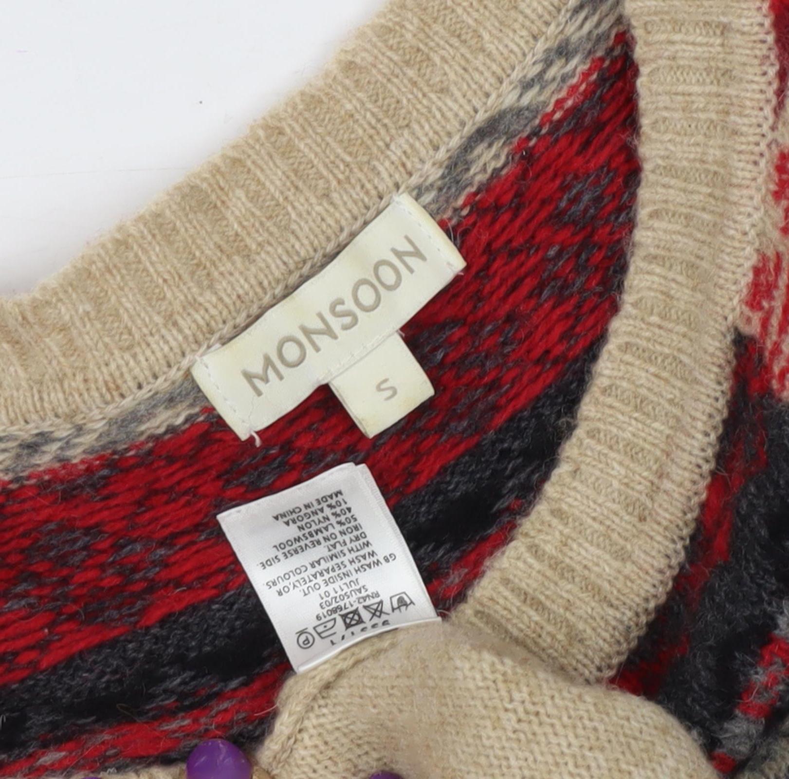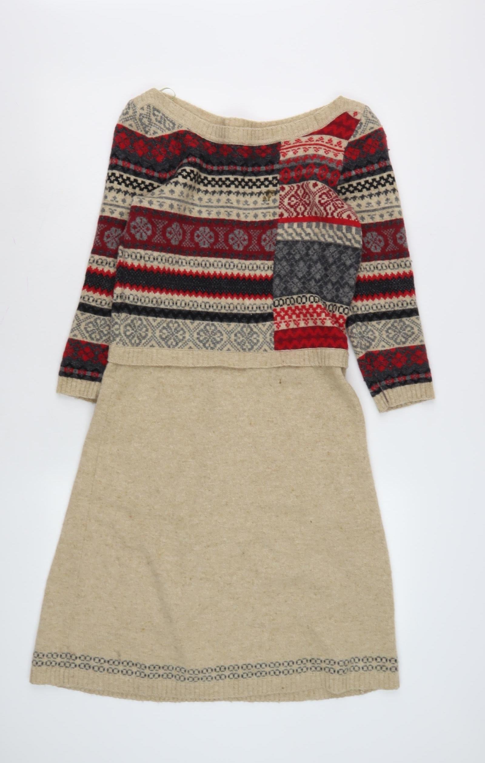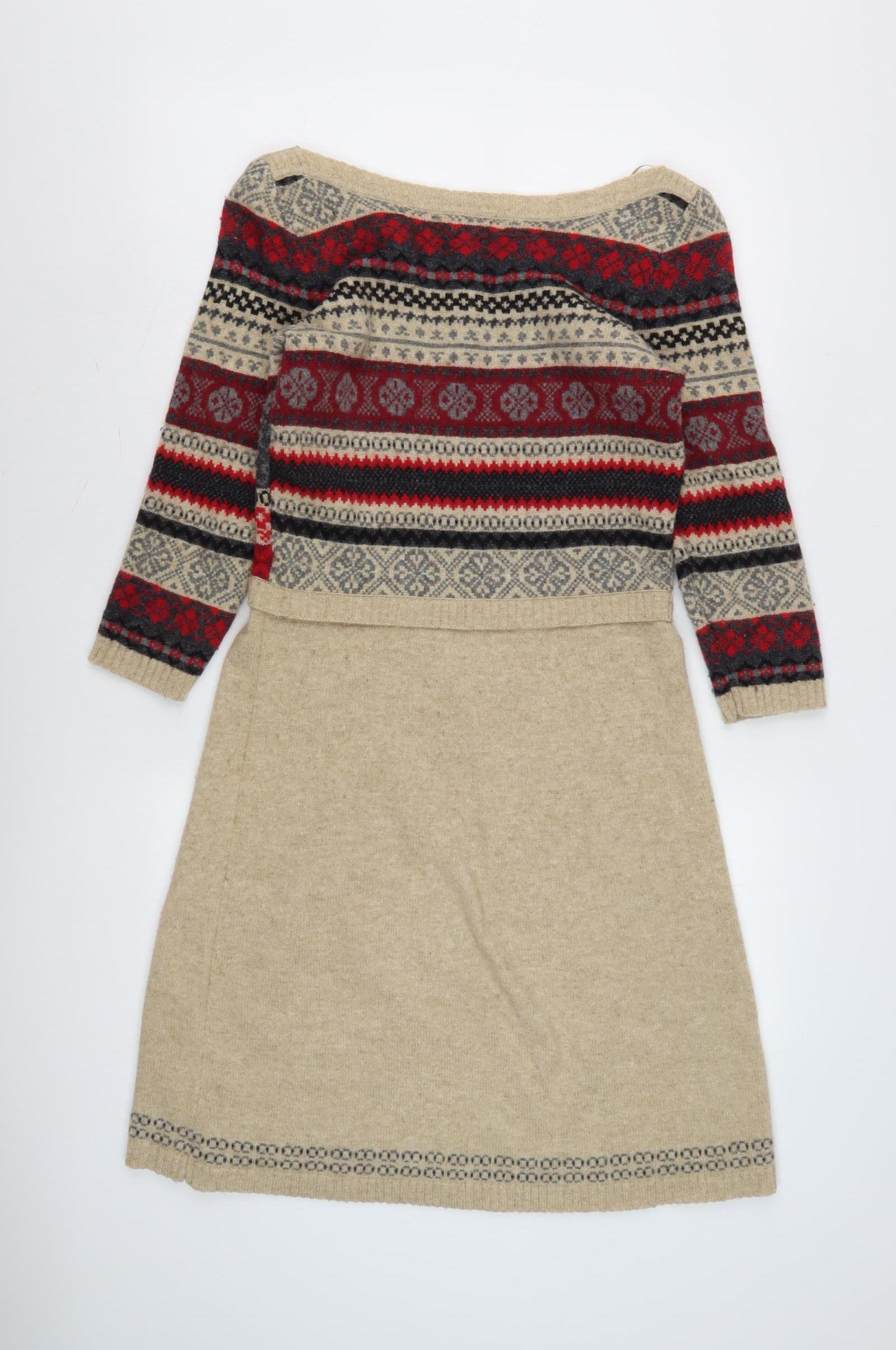 Step into the cozy charm of the season with this delightful Monsoon women's Fair Isle dress. Designed in an A-Line style, this dress embodies classic comfort fused with festive character. Featuring a luxurious blend of wool, viscose, nylon, and cotton, the fabric offers both warmth and a gentle touch against your skin, making it an ideal choice for autumn and winter wear.The multicoloured palette showcases vibrant reds, blues, and neutral tones intricately woven into a stunning Fair Isle pattern, adding a pop of colour to any wardrobe. The dress is designed with a flattering boat neckline and 3/4 sleeves, offering a relaxed yet chic silhouette. The pullover style ensures easy wearability, perfect for those busy mornings or spontaneous outings.Whether you're heading out for a casual brunch with friends or settled in for a cozy evening by the fire, this versatile dress suits both laid-back weekends and charming casual gatherings. The regular size S fits comfortably, offering a relaxed fit that can easily be paired with your favorite belt or accessories to tailor your unique style.This dress, in very good condition, does contain a light stain on the front, which is reflected in the tempting price, offering exceptional value. Hand wash only to maintain the integrity of the fabric and keep the colours vibrant throughout the seasons.Embrace a piece that not only radiates warmth but also offers enduring style, seamlessly combining heritage patterns with contemporary design, making it a wardrobe staple you'll cherish for years to come.
