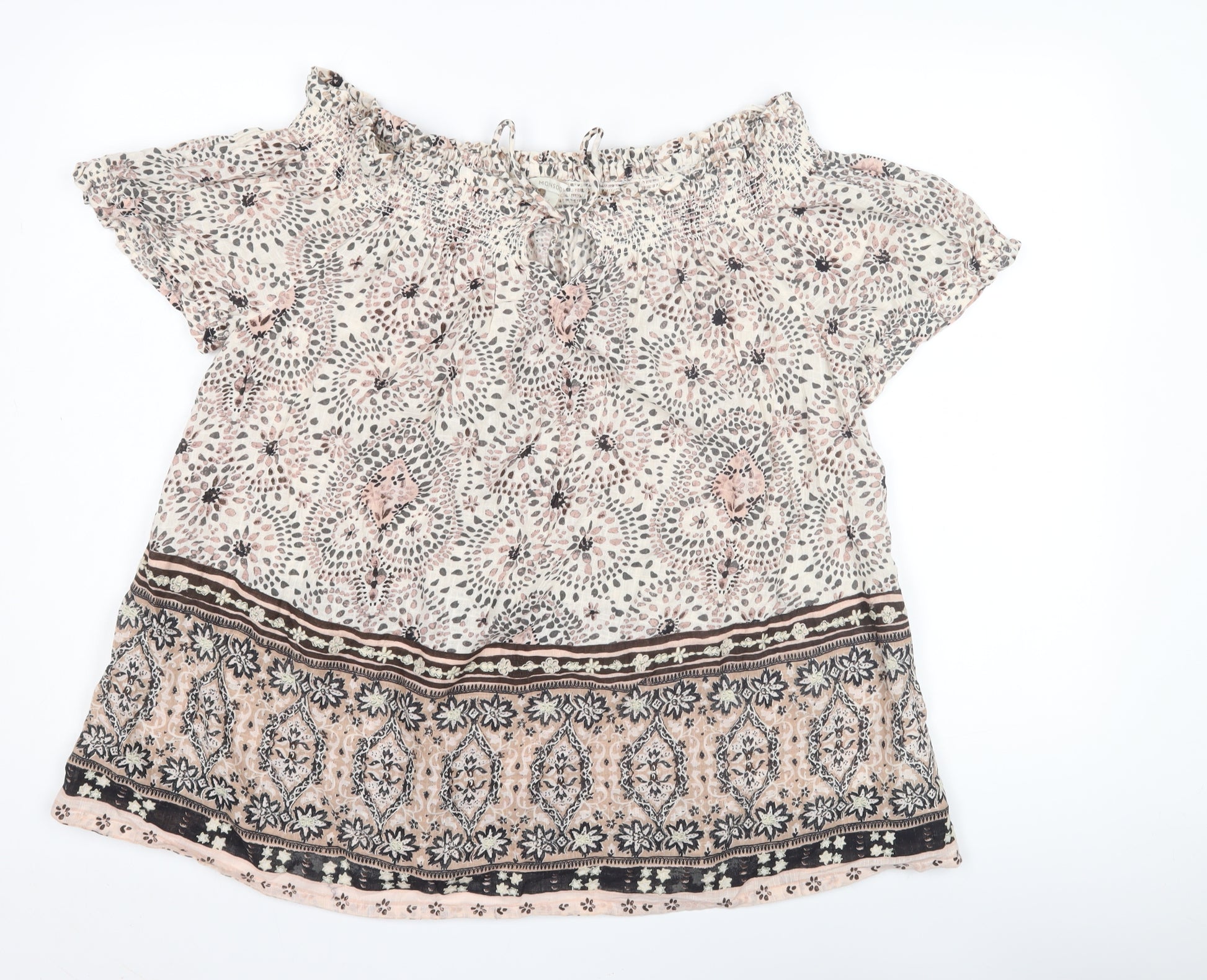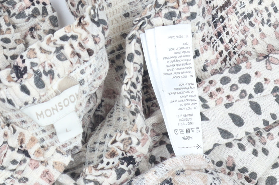 Add a touch of elegance to your wardrobe with this stunning Monsoon floral blouse, perfect for any fashion-savvy woman. Made from 100% cotton, this blouse ensures comfort and breathability, making it ideal for all-day wear. The multicoloured floral pattern is beautifully complemented by the off-the-shoulder neckline, adding a feminine and stylish flair to your outfit. Designed for a regular fit, this blouse features short sleeves that elevate its casual elegance, making it versatile for various occasions, whether you're attending a casual lunch or an afternoon outing. With a size L, it offers a comfortable fit for women, highlighting Monsoon's dedication to quality and fashion. Although previously owned, this blouse is in excellent condition, showcasing its well-maintained fabric and design. Whether paired with jeans for a relaxed look or a skirt for a chic ensemble, this Monsoon blouse is a must-have addition to your collection. Embrace sophistication and comfort with this beautiful piece, crafted to make you look and feel your best.