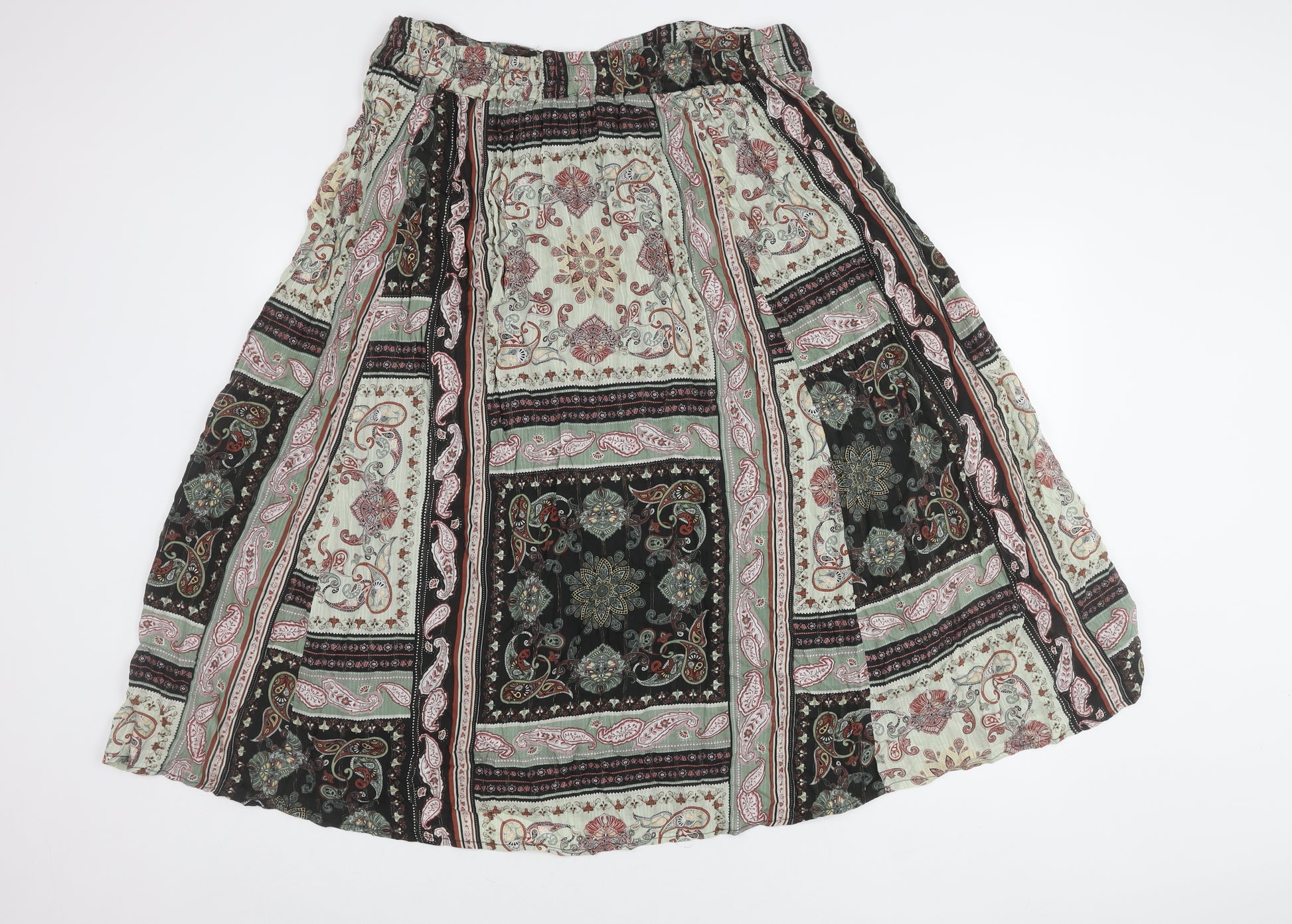 Elevate your wardrobe with this lovely multicoloured Monsoon skirt, ideal for casual occasions. Crafted with an eye-catching paisley pattern, it brings a vibrant touch to any ensemble. Designed with a comfortable elastic waist, it ensures a perfect fit while enhancing your silhouette. Perfect for women, this regular-sized XL skirt is versatile enough for all seasons. Although devoid of original tags, it remains in excellent condition with no noticeable flaws. Enrich your style with this chic piece that blends bohemian flair with contemporary elegance. Don't miss out on the chance to add this fabulous Monsoon skirt to your collection. It's machine washable, providing effortless maintenance for everyday wear.