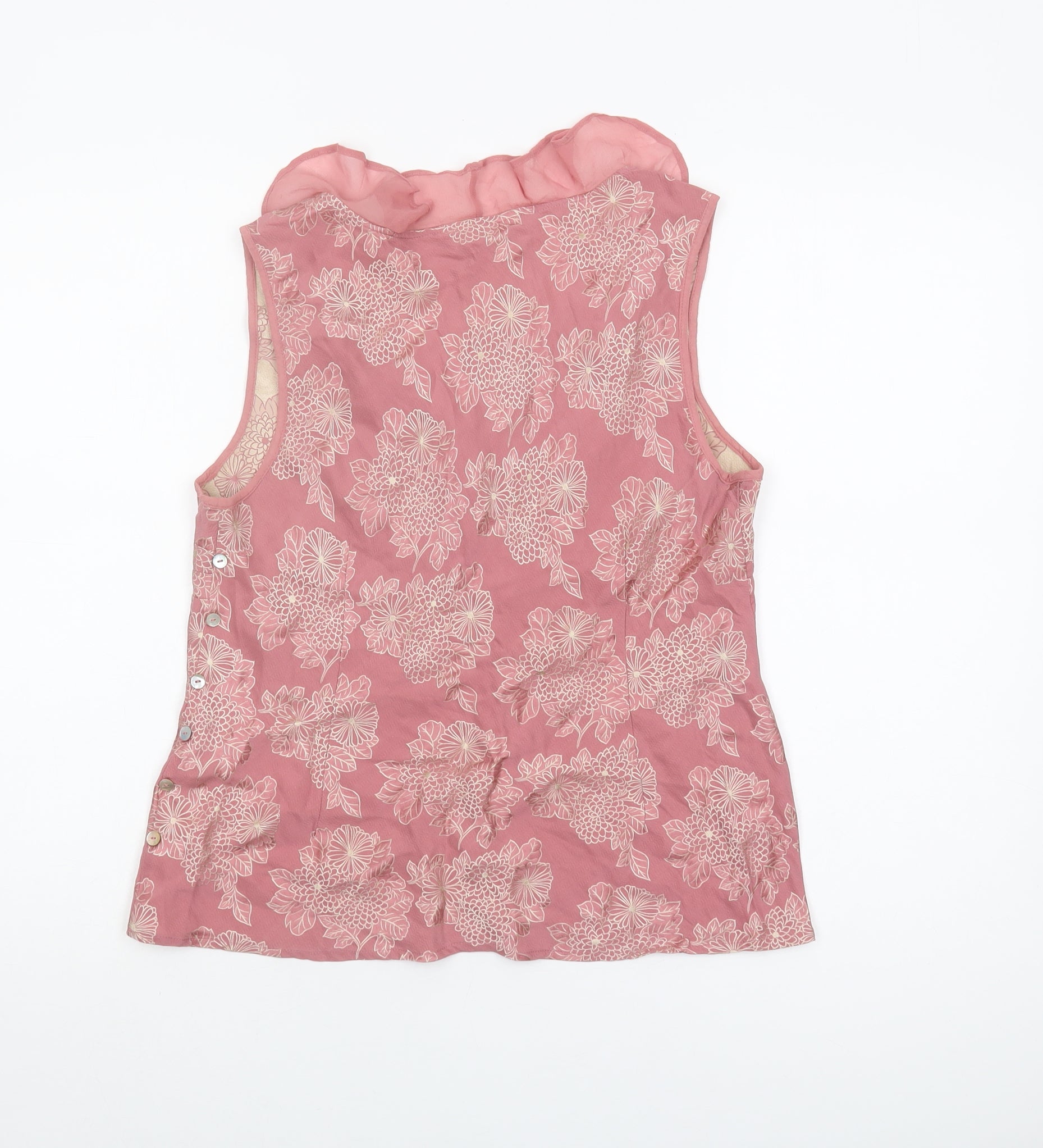 Enhance your wardrobe with this exquisite Monsoon blouse, perfect for adding a touch of elegance to your everyday look. Crafted in a delightful pink floral pattern, this sleeveless blouse exudes charm and femininity, making it ideal for casual spring and summer outings. Made from a luxurious blend of 55% silk and 45% viscose, it offers a soft, comfortable feel against your skin. The elegant ruffle detail adds just the right amount of flair, while the regular fit ensures a flattering silhouette. Despite its sophisticated appearance, this blouse remains versatile for various occasions, from casual gatherings to laid-back workwear. Being in excellent condition, this Monsoon blouse has no visible signs of wear or damage, presenting itself as a pre-loved item with plenty of life left. Treat yourself with this enchanting piece and make it a staple in your spring and summer collection.