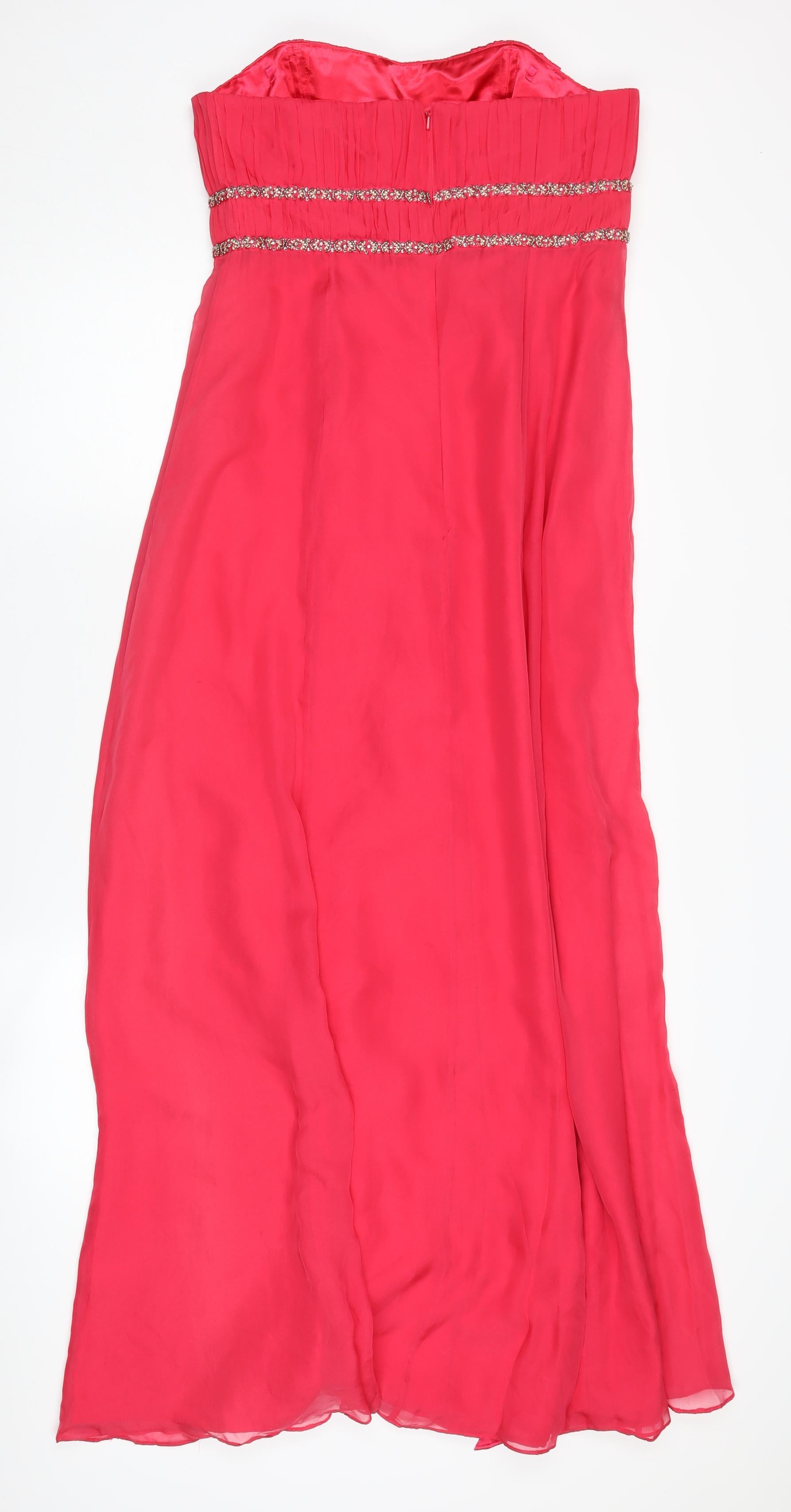 This stunning Monsoon women's dress is an eye-catching piece perfect for your next party or cocktail event. In a vibrant pink hue, this strapless dress is crafted entirely from luxurious silk, offering a beautiful sheen and soft touch that drapes elegantly. The accented beaded detailing with rhinestones adds a touch of sparkle and glamour, making it a standout choice for special occasions. The dress is sleeveless and features a secure zip closure, providing both comfort and ease of wear. Designed to flatter, it is fully lined for a smooth silhouette and includes a gorgeous sweetheart neckline, enhancing its feminine appeal. Whether you're attending a wedding, cocktail party, or evening event, this dress ensures you make an entrance with its exquisite design. Suitable for spring and summer, the breathable silk material ensures you stay cool while looking chic. With its elegant simplicity and luxurious detailing, this Monsoon dress will be a cherished addition to your wardrobe. Perfect for making an impression, this dress embodies sophisticated glamour and timeless style.