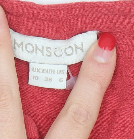 Discover effortless style with this Monsoon women's sleeveless blouse, perfect for adding a splash of vivid red to your summer wardrobe. Crafted from soft, breathable 100% viscose, this blouse ensures comfort while maintaining a relaxed fit that's ideal for casual outings. Its solid red colour makes it a versatile piece, capable of enhancing any ensemble. Designed with a button accent, this blouse adds a touch of elegance without compromising simplicity. The sleeveless design provides ease of movement, making it perfect for warm-weather wear. Whether you're dressing it up with statement jewellery or keeping it casual with your favourite jeans, this blouse is sure to become a staple in your collection. With excellent pre-owned condition and priced reasonably, it's a fantastic find for fashion enthusiasts. Don't miss the chance to buy this must-have Monsoon blouse at an incredible value and give your wardrobe an easy, stylish update!