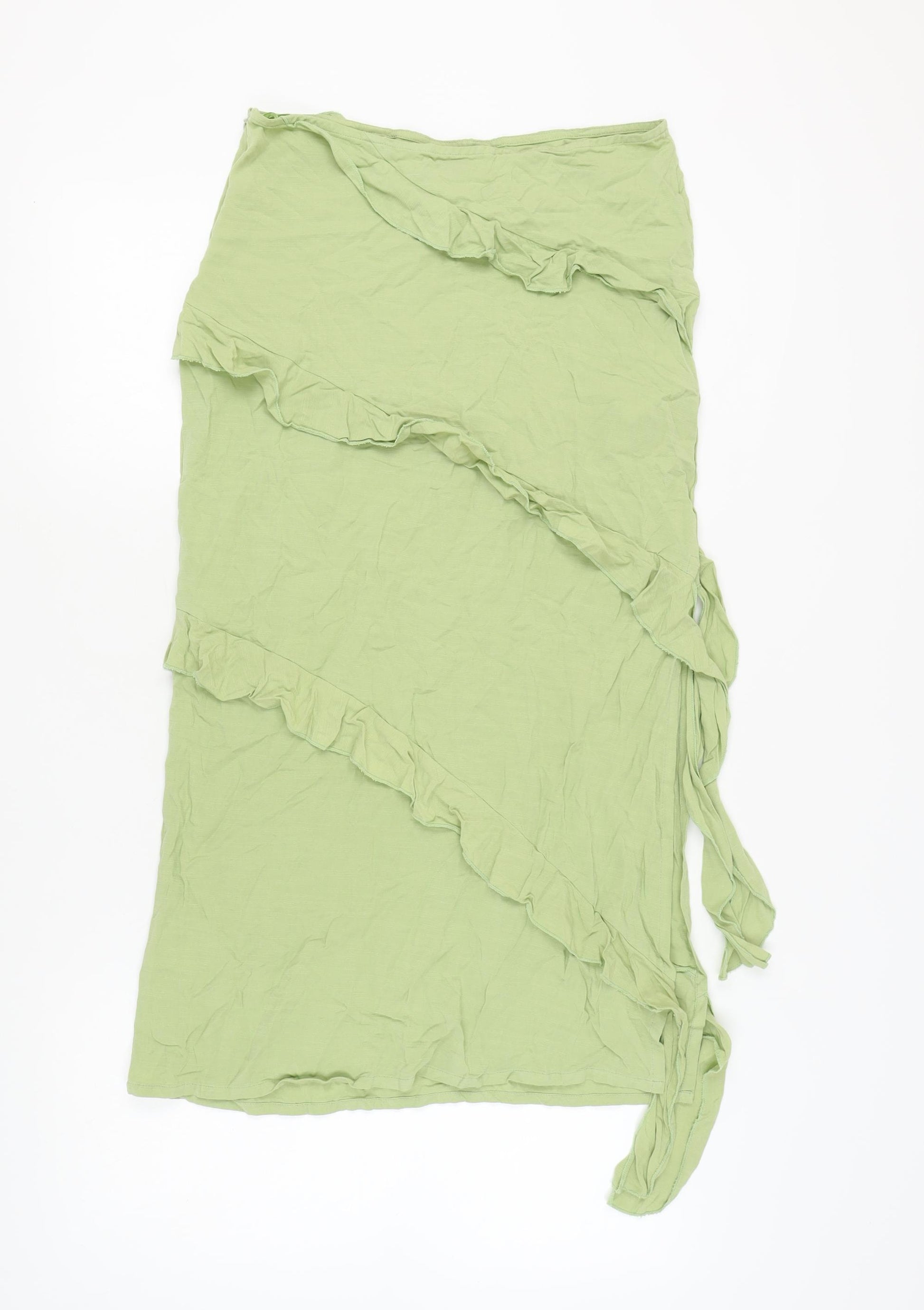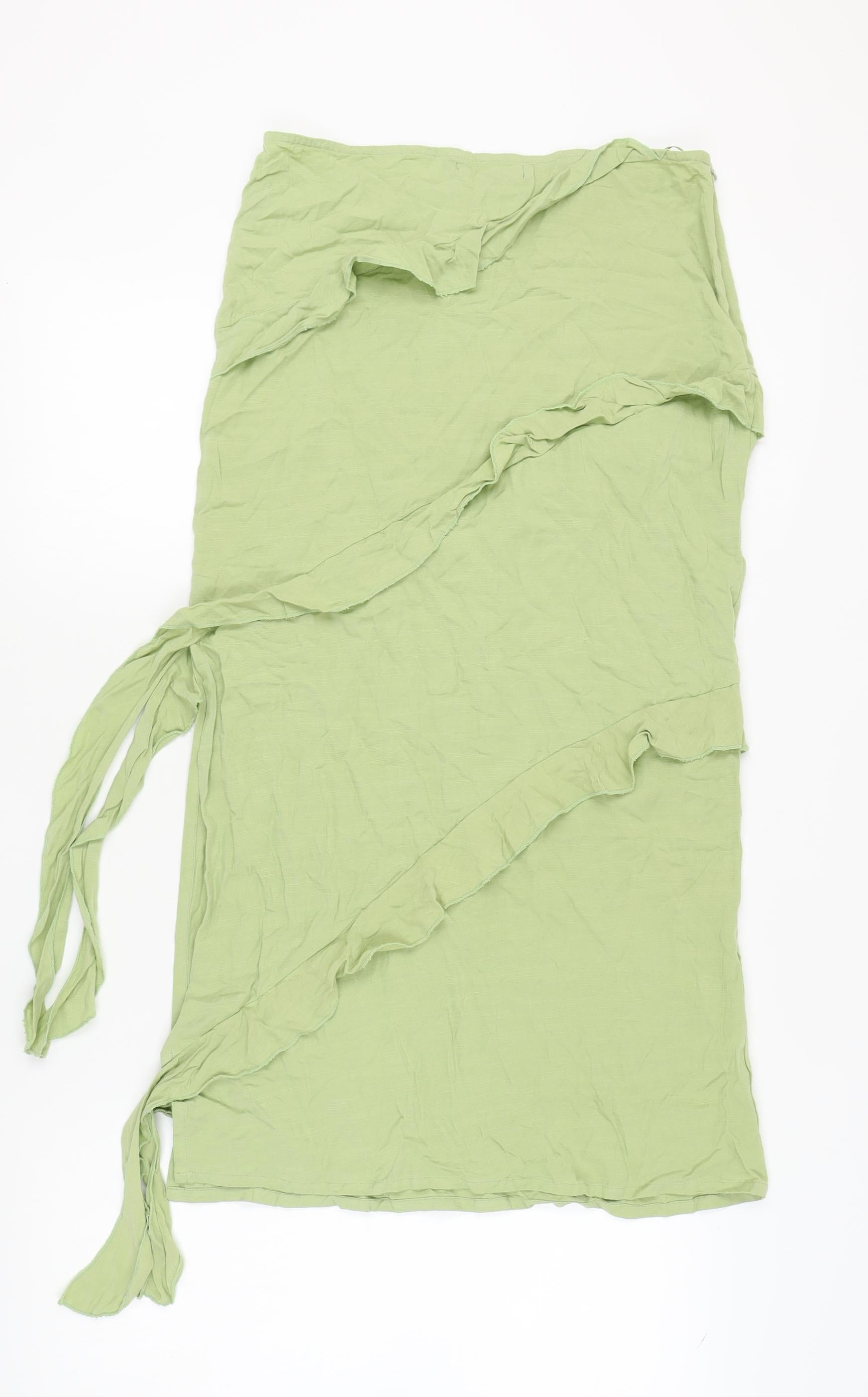 This charming Motel wrap skirt in a refreshing green hue embodies effortless style and comfort. Designed with a flattering midi length, the ruffle accents add a touch of femininity and movement. Made from 100% viscose, this skirt is perfect for the warm spring and summer months, ensuring you stay cool and fashionable. Its tie closure offers an adjustable fit, making it a versatile choice for casual occasions. The skirt's plain design makes it easy to pair with various tops, from blouses to simple t-shirts, allowing you to create multiple chic outfits. Although the skirt has a wrinkled look, there is no visible damage, and it's in excellent condition. With its hand wash care instructions, this skirt is easy to maintain, ensuring it remains a staple in your wardrobe. Embrace the simplicity and elegance of this Motel creation and make it a go-to piece in your everyday collection.