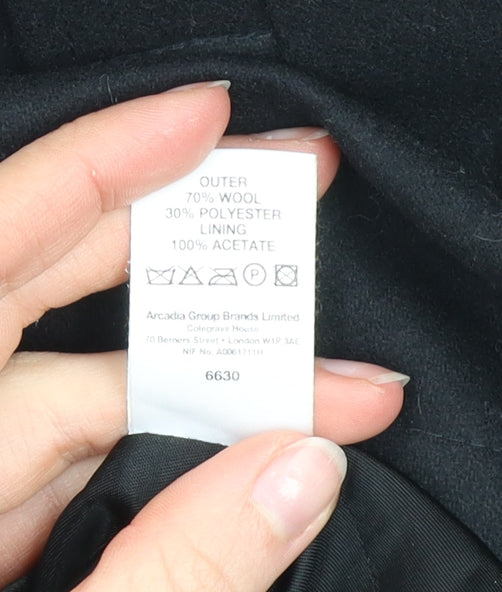 Step into timeless sophistication with this Moto Menswear black wool blend overcoat, an essential addition to any refined wardrobe. Tailored in a classic mid-length cut, this sleek black coat delivers both warmth and style, perfect for colder months and transitional weather. The premium outer shell is crafted from a high-quality blend of 70% wool and 30% polyester, creating an ideal balance of softness, durability, and comfort. The smooth 100% acetate lining enhances wearability, making it easy to layer over suits or knitwear.This men’s overcoat features a point collar, button fastening, and deep front pockets for practical elegance. Its regular fit allows for comfortable movement without compromising on silhouette, making it ideal for business meetings, formal events, or smart-casual outings. The minimalist design ensures versatility, pairing seamlessly with tailored trousers, chinos, or denim alike. With its clean lines and understated detailing, this Moto coat projects effortless sophistication.Perfect for autumn and winter wear, the coat combines timeless tailoring with functional warmth. The durable wool-blend construction offers excellent insulation while remaining breathable, ensuring comfort across varying temperatures. Finished in an elegant black tone, it’s easy to pair with any outfit, making it a true wardrobe staple.Although pre-owned, this coat remains in excellent condition with only light signs of wear and minor lint evidence — a small trade-off for its enduring quality and stylish look. Designed by Moto Menswear, this coat offers exceptional value for those seeking an elevated yet practical outerwear piece. Whether commuting to the office, dressing for a formal dinner, or enjoying a weekend engagement, this coat ensures you stay smart, warm, and effortlessly refined.A perfect choice for the modern man who appreciates timeless outerwear, this black wool blend Moto coat promises to deliver both comfort and elegance season after season.