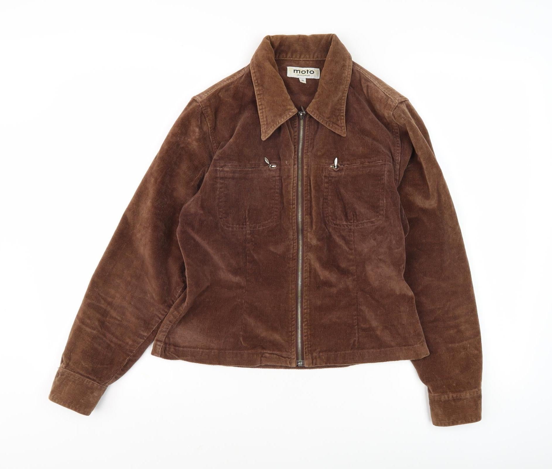 Step out in style with this elegant Moto corduroy jacket in a rich brown shade, perfect for adding a touch of sophistication to your casual wardrobe. Designed for women, this regular fit jacket is crafted from high-quality cotton corduroy, ensuring comfort and durability. With its classic collared style and convenient full-zip closure, this jacket offers both style and practicality. Ideal for the cooler months of autumn and winter, it provides a snug fit with long sleeves that keep the chill at bay. Accented with buttons and a zip, it adds a stylish edge to your look, whether you're heading out for a casual meet-up or a laid-back evening stroll. The short length and regular size 14 make it versatile enough to pair with jeans or more tailored bottoms, making it an essential piece in your everyday wardrobe. In very good condition with only light wear, this jacket is ready to bring a classic touch to your collection. Embrace timeless fashion with this Moto jacket and make a chic statement wherever you go.