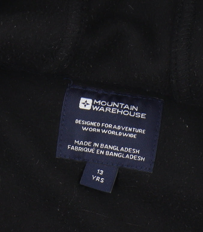 Keep your child warm and stylish with this Mountain Warehouse Boys Black Fleece Hooded Jacket, perfect for the colder autumn and winter months. Crafted from a comfortable polyester fleece fabric, this mid-length jacket offers soft warmth and a snug hood to keep chilly winds at bay. Its classic black colour provides versatility, making it easy to pair with any outfit. The jacket features a practical full zip closure for easy wear, while its pockets add convenience for carrying small essentials. Designed with casual occasions in mind, this jacket is ideal for everyday wear, whether for a walk in the park or a casual outing with family. Though no original tags are visible, the jacket remains in excellent condition without any noticeable stains or tears, ensuring it looks great and performs well. Machine washable for easy care, this jacket is a fantastic addition to your child's wardrobe. Available in size 13 years, it's designed to fit comfortably while allowing for regular movement. A great choice for layering during unpredictable weather, this jacket balances style and functionality effortlessly. Don't miss out on adding this practical and fashionable piece to your child's collection.