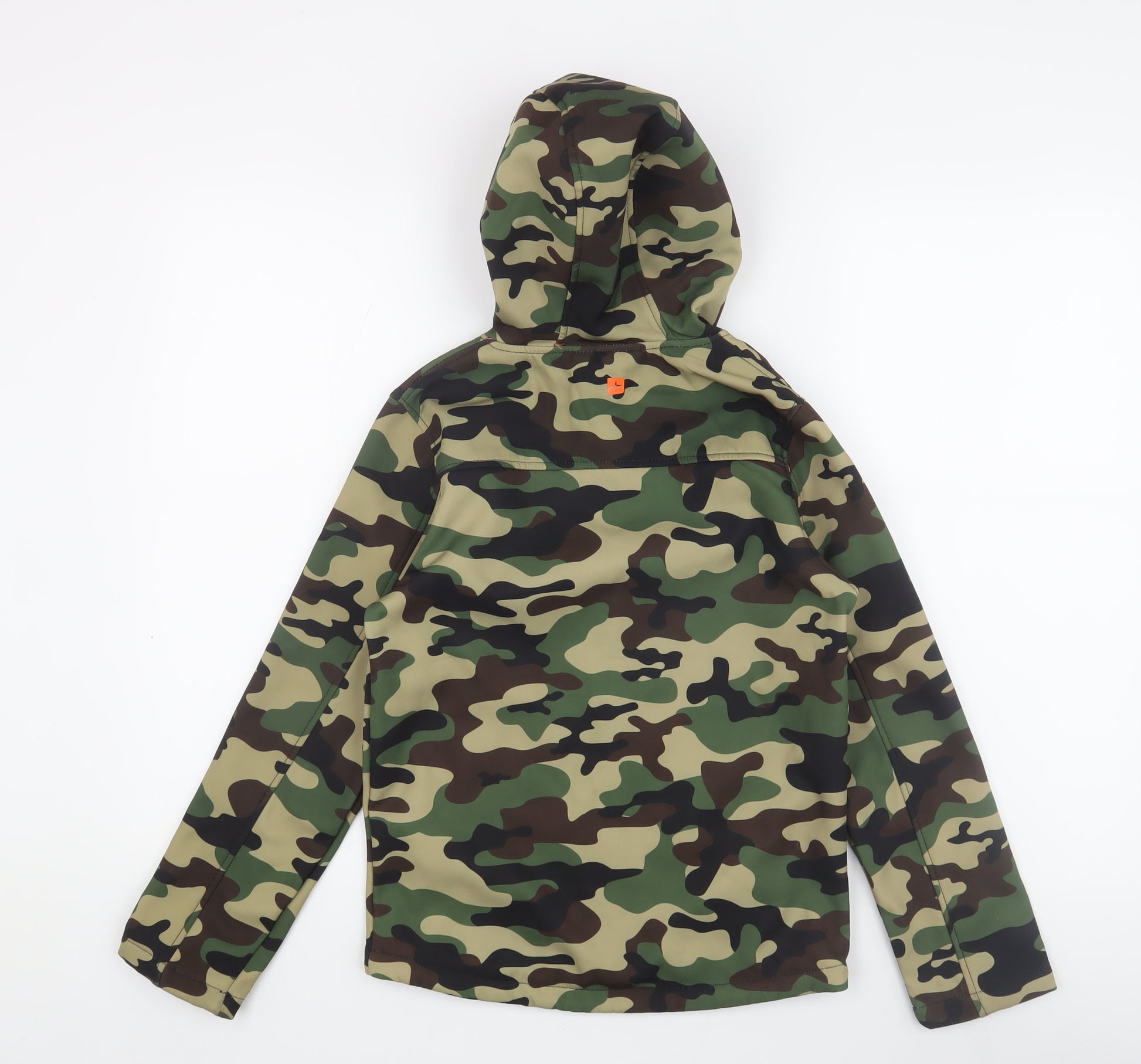 Elevate your child's outerwear collection with this Mountain Warehouse Boys Camo Softshell Jacket, designed to provide superior comfort and protection during outdoor adventures. Perfect for active youngsters, this jacket comes in a versatile green camouflage pattern that adds a trendy touch to any casual outfit. Crafted from durable polyester with a touch of elastane, it offers flexibility and durability to withstand the rigours of outdoor play. The softshell design is lightweight and features a water-resistant finish, making it ideal for hiking, exploring, and other outdoor activities in unpredictable weather conditions. This jacket comes with a convenient full-zip closure for easy wear and adjustable hood to offer enhanced protection against the elements. An excellent piece for the cooler seasons, it keeps your child warm without adding extra bulk. The machine-washable fabric ensures easy care, making it a practical choice for busy parents. It features a regular fit, long sleeves, and soft fleece lining for extra comfort, perfect for layering over jumpers or shirts. Ideal for autumn, winter, and spring wear, this jacket ensures your child is ready for any adventure. With its excellent condition, this activewear jacket will quickly become a wardrobe staple, combining style, function, and comfort for your boy's active lifestyle.