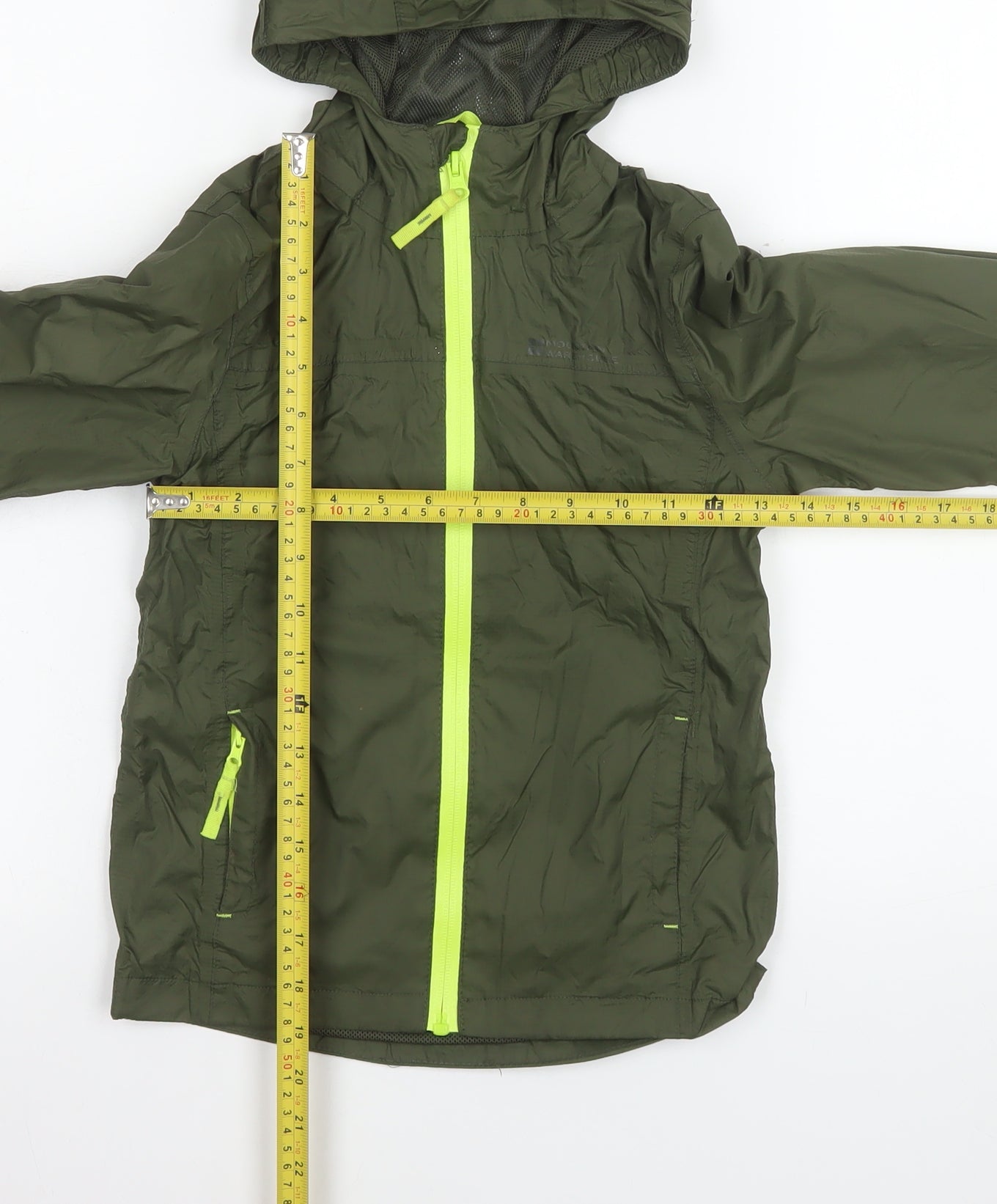Keep your young explorer comfortable and protected with this Mountain Warehouse boys’ hooded windbreaker jacket in a sleek dark green colour with bright lime accents. Designed with practicality and performance in mind, this jacket is made from 100% nylon with a durable ripstop finish and fully lined with soft polyester mesh for added breathability. The lightweight construction makes it ideal for outdoor activities, travel, and everyday wear during the spring and autumn months. Featuring a full front zip for easy wear, two secure zipped pockets for essentials, and a weather-resistant design, this jacket is both functional and stylish. The attached hood offers additional protection on breezy or drizzly days, while the elasticated cuffs ensure a snug, comfortable fit. The clean design with minimal details provides a casual yet sporty look, ideal for school runs, countryside walks, or family adventures. Built by Mountain Warehouse—a trusted brand known for outdoor performance gear—this jacket ensures durability without compromising on comfort. Machine washable for easy care, it’s the perfect grab-and-go layer for unpredictable UK weather. In excellent pre-owned condition with no visible flaws, this jacket makes a fantastic addition to any active boy’s wardrobe, combining quality construction with everyday practicality. Whether for hiking, playground fun, or weekend getaways, it’s a reliable choice that delivers style, comfort, and protection in one. Don’t miss the opportunity to own this versatile Mountain Warehouse windbreaker at a great price, ready to keep your child dry, comfy, and adventure-ready in changing seasons.