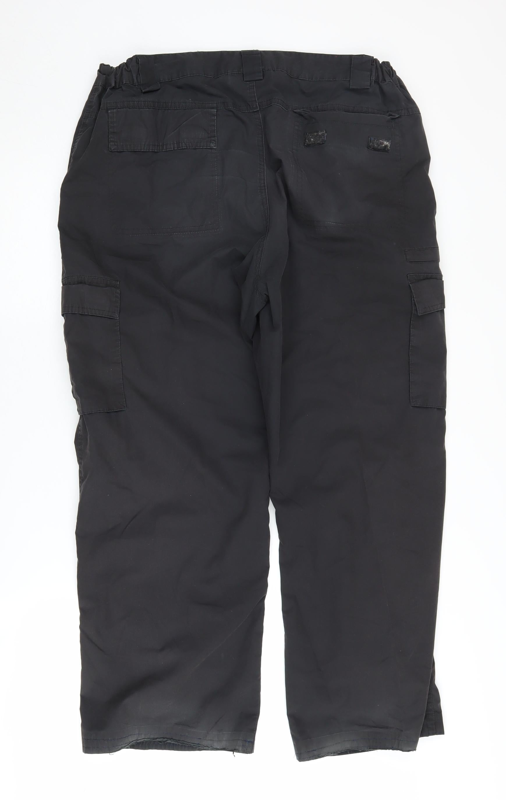 Explore the outdoors with confidence wearing these Mountain Warehouse Men's Black Cargo Trousers. Specially designed for the modern adventurer, these trousers offer a perfect blend of style and functionality. Crafted with durable polyester and soft cotton, they provide comfort and resilience during your travels. The practical cargo style with multiple pockets makes it ideal for on-the-go storage, allowing you to keep essential items within reach. Whether you're heading out on a hiking trip or need something functional for everyday wear, these trousers are your go-to choice. The classic black colour enhances versatility, making it easy to pair with a wide range of tops and jackets. Featuring a straight leg style and mid-rise fit, they ensure a flattering silhouette, while the elastic waist and zip accents add to the comfort and practicality. Suitable for various occasions such as casual outings or travel adventures, these trousers promise to be a valuable addition to your wardrobe. Despite minor wear on the hem, they remain in good condition, ready to accompany you on your next outdoor escapade. Don't miss the opportunity to own this essential piece of outdoor apparel at a great price.