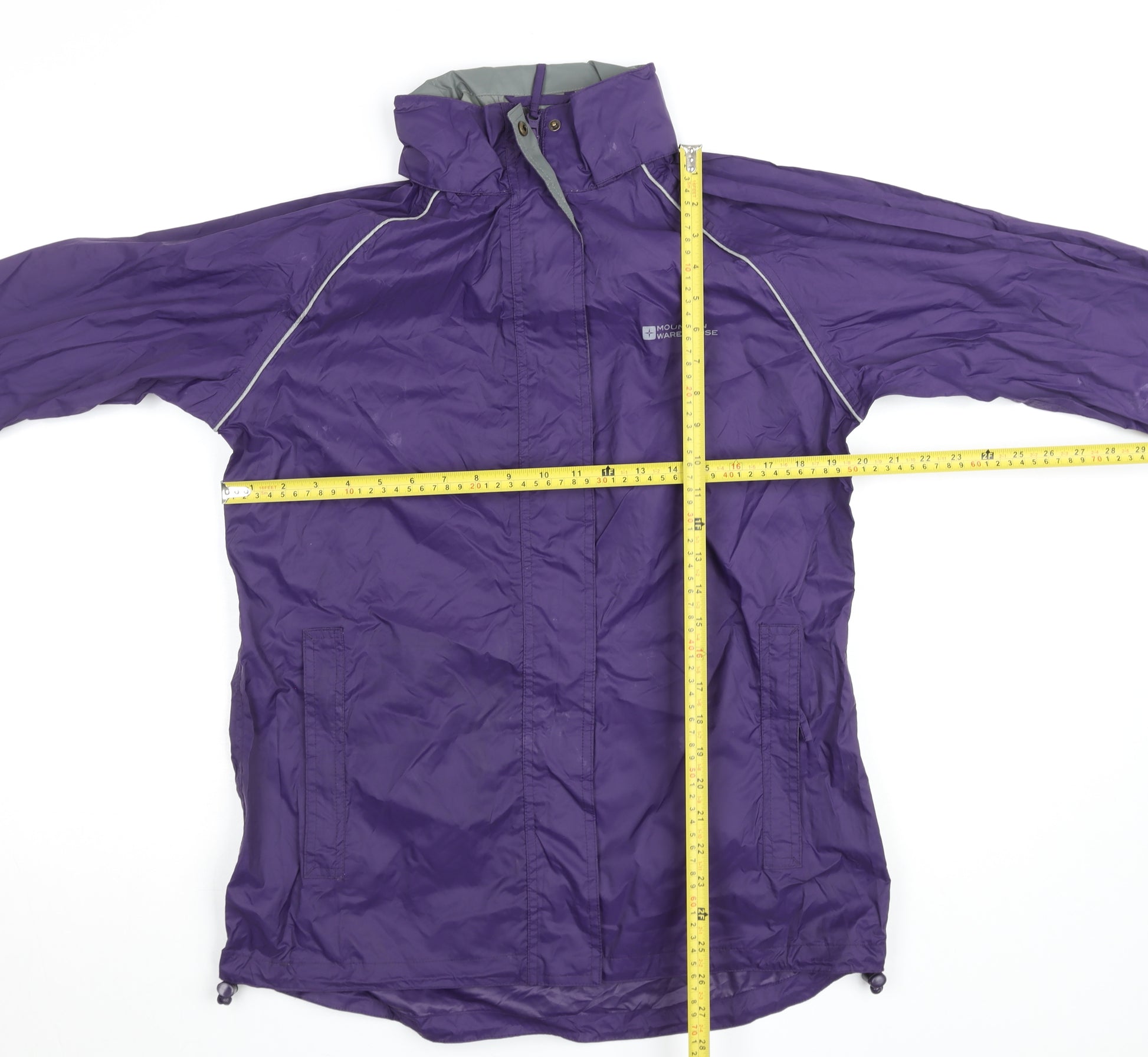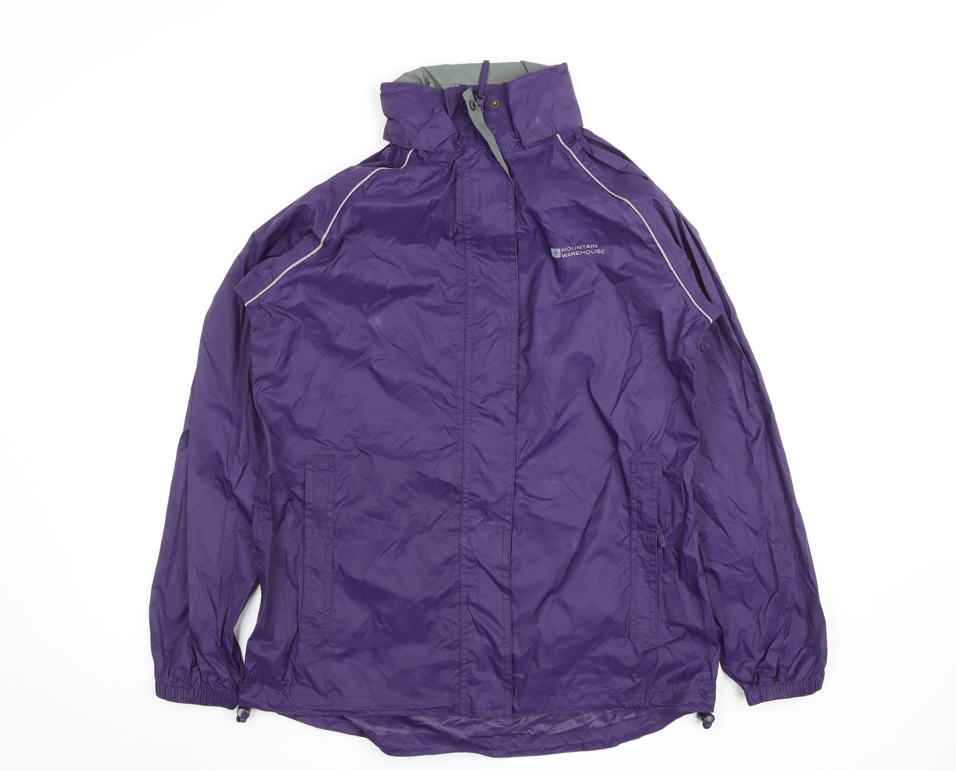 Stay comfortable and dry regardless of the weather with this Mountain Warehouse waterproof jacket for women. Crafted in a striking purple hue, this mid-length rain coat is designed for durability, function, and outdoor adventures. Made from 100% polyester, the jacket provides lightweight yet robust protection from the elements. The windproof and water-resistant fabric, paired with a breathable polyester lining, ensures that you remain warm and dry during unpredictable weather conditions. Featuring reflective piping for added visibility, this outdoor jacket also includes practical details such as a full zip fastening with a protective storm flap, adjustable hem drawcords for a close fit, and secure zipped pockets to keep your essentials safe.This jacket offers a relaxed, regular fit—ideal for layering over mid-weight clothing on cooler days. The high collar and hood provide additional protection against wind and rain, making it perfect for hiking, travel, or daily use in the city. Designed with practicality in mind, it’s easy to pack for weekend trips or commutes and simple to maintain as it’s machine washable. The subtle Mountain Warehouse logo on the chest adds a stylish touch to this functional piece. Excellent for use across multiple seasons—spring for showers, autumn for blustery walks, and winter with an added fleece—it’s a reliable outerwear staple suitable for multiple occasions from casual wear to active outdoor use. In very good condition with minimal signs of wear, this jacket is an affordable and reliable choice for anyone looking for practicality, comfort, and style combined. Perfect for those who value versatile outerwear, this Mountain Warehouse purple waterproof jacket blends performance and fashion effortlessly—offering a colourful and protective addition to any wardrobe.