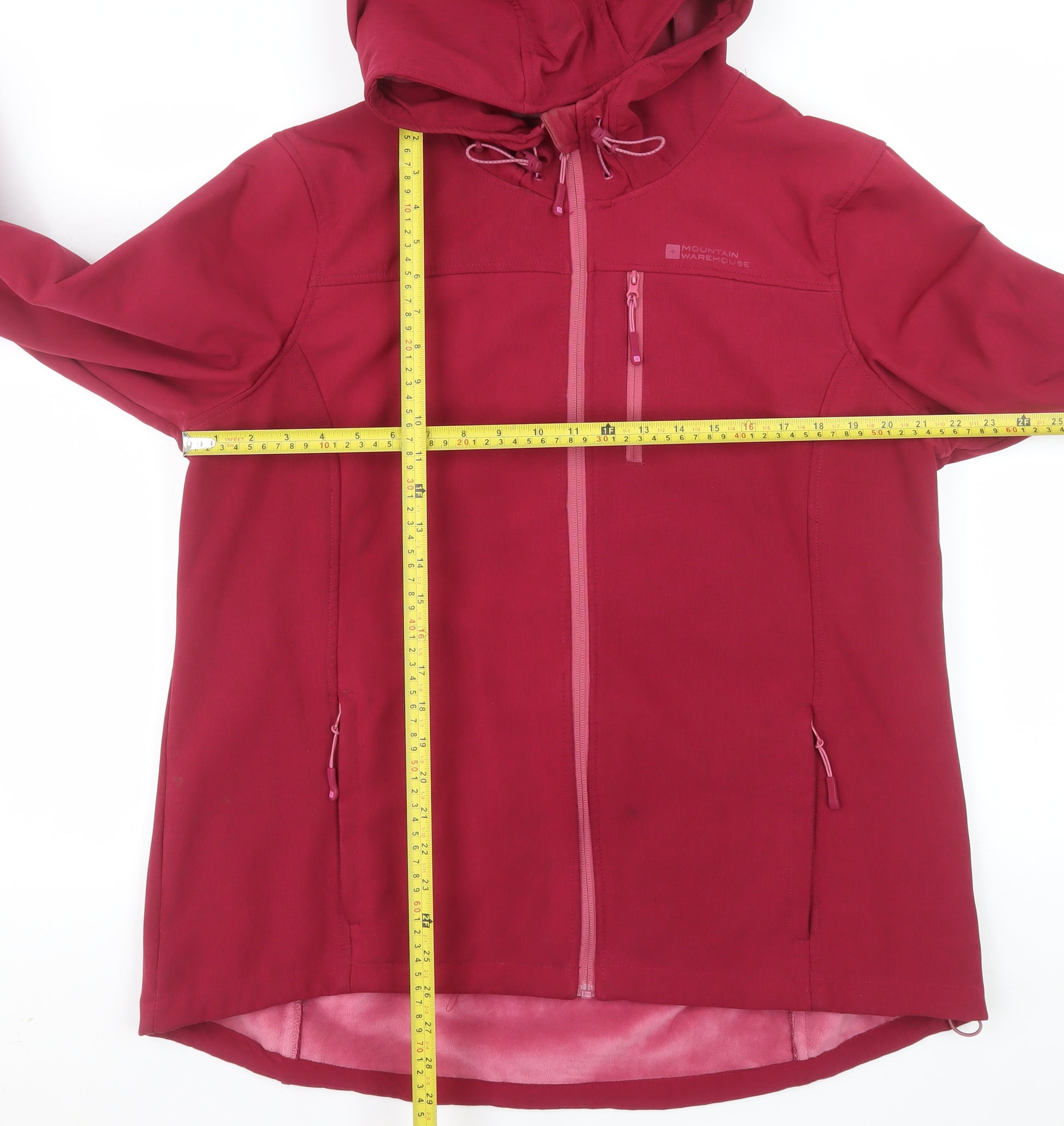 Add reliable weather protection and style to your wardrobe with this Mountain Warehouse women's softshell jacket in a rich red tone. Designed for practicality, comfort, and outdoor versatility, this piece is ideal for transitional seasons or brisk winter days. Crafted with a durable outer shell of 92% polyester and 8% elastane, it features a flexible, breathable structure that allows ease of movement while offering windproof and water-resistant properties. The jacket’s brushed polyester lining provides superb insulation, helping to keep you warm and comfortable during outdoor activities or everyday errands.The sleek, mid-length design includes a full-zip front closure with three zip-secured pockets—two at the sides and one positioned on the chest for added functionality. A drawstring-adjustable hood offers extra protection against the elements, complemented by adjustable cuffs that help keep out cold air. Designed in the United Kingdom, this jacket embodies Mountain Warehouse’s focus on performance, making it perfect for casual wear, hiking, travel, or the daily commute.This piece is finished in a simple, clean style with no pattern, making it easy to pair with various outfits. A practical choice for outdoor enthusiasts and commuters alike, it ensures reliable protection without compromising comfort or movement. The overall condition is very good, showing only minimal signs of previous wear, including a faint mark not affecting performance or appearance.Whether you’re exploring trails, taking a city stroll, or adding an extra layer for travel, this softshell jacket combines lightweight portability with dependable warmth and water resistance. Well-suited for autumn, spring, and winter seasons, it offers durability and timeless design at an excellent value. Refresh your wardrobe with this versatile, high-quality outerwear that blends functionality with a contemporary look, designed to withstand changing weather while keeping you comfortable and stylish wherever your day takes you.