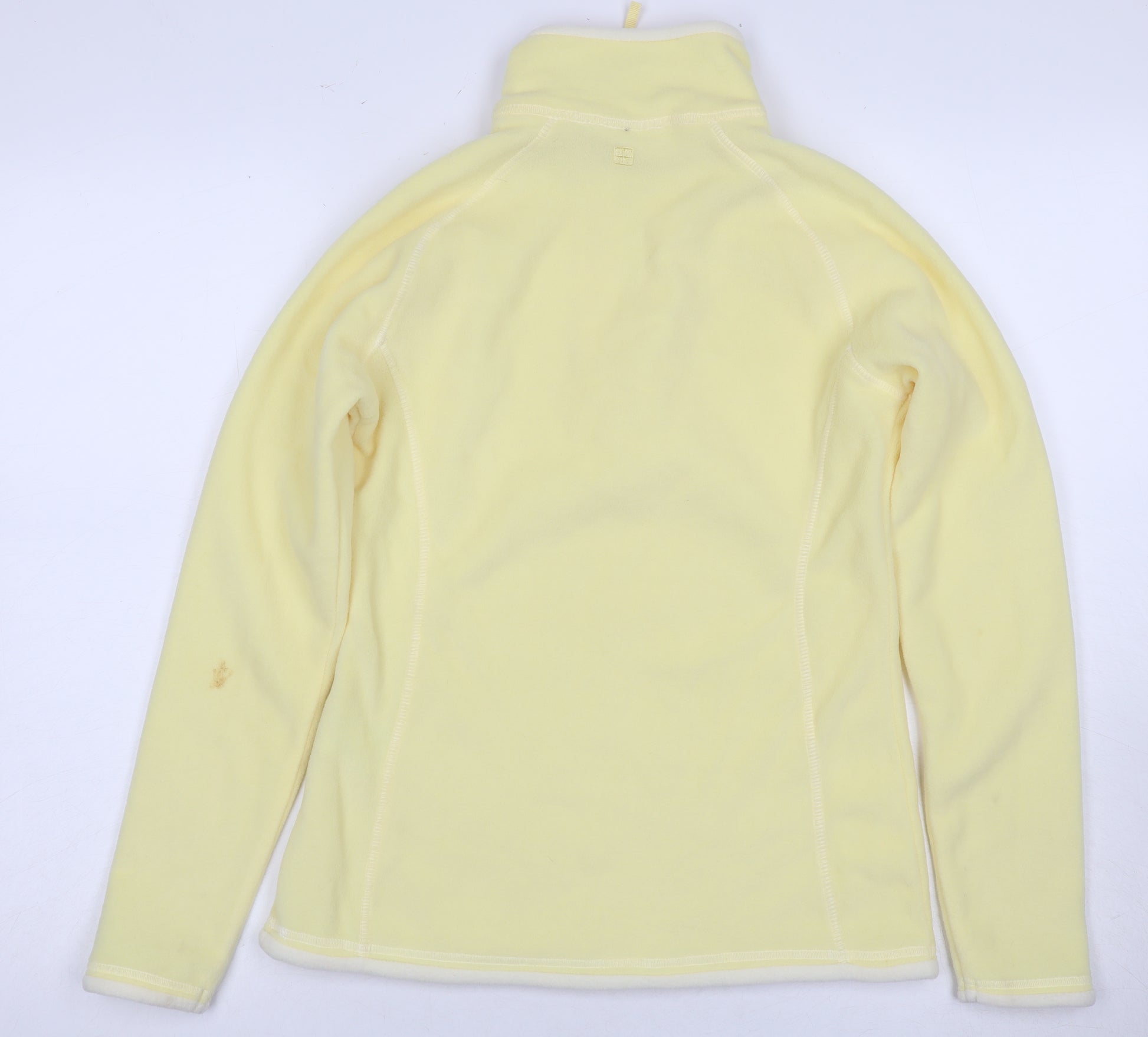 Embrace the outdoors with this Mountain Warehouse women's pullover, designed for adventure and comfort. The bright yellow hue adds a pop of colour to your outdoor wardrobe while the fleece material ensures warmth and comfort. Crafted from 100% polyester, this lightweight sweatshirt is both durable and easy to care for, perfect for autumn, spring, and winter adventures. The 1/2 zip closure makes for easy layering and adjustable ventilation. Ideal for hiking, this sweatshirt boasts a regular fit with raglan sleeves for added mobility. Despite its activewear nature, the pullover maintains a stylish edge with its high neckline and clean, pattern-free design. Sized at UK 16, it offers a comfortable fit with a chest size of 42 inches. Although pre-loved, it's in very good condition with only a slight stain on the sleeve, making it a great addition to your collection at a fantastic price. Machine washable for easy maintenance, this piece is perfect for those who seek both functionality and style.