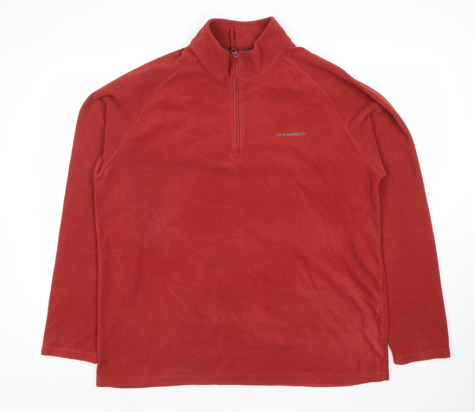 This Mountainlife red pullover sweatshirt, tailored for men in XL size, is an ideal choice for those chilly autumn and winter days. Crafted from 100% polyester fleece, it ensures warmth and comfort while being easy to care for with its machine washable feature. The sweatshirt's stylish high neck and classic long sleeves add a touch of elegance, while the convenient 1/2 zip closure offers versatility in wear. With its plain, no-pattern design, this sweatshirt is perfect not only for lounging but also for outdoor activities. In excellent condition with no signs of wear, it promises both durability and style.