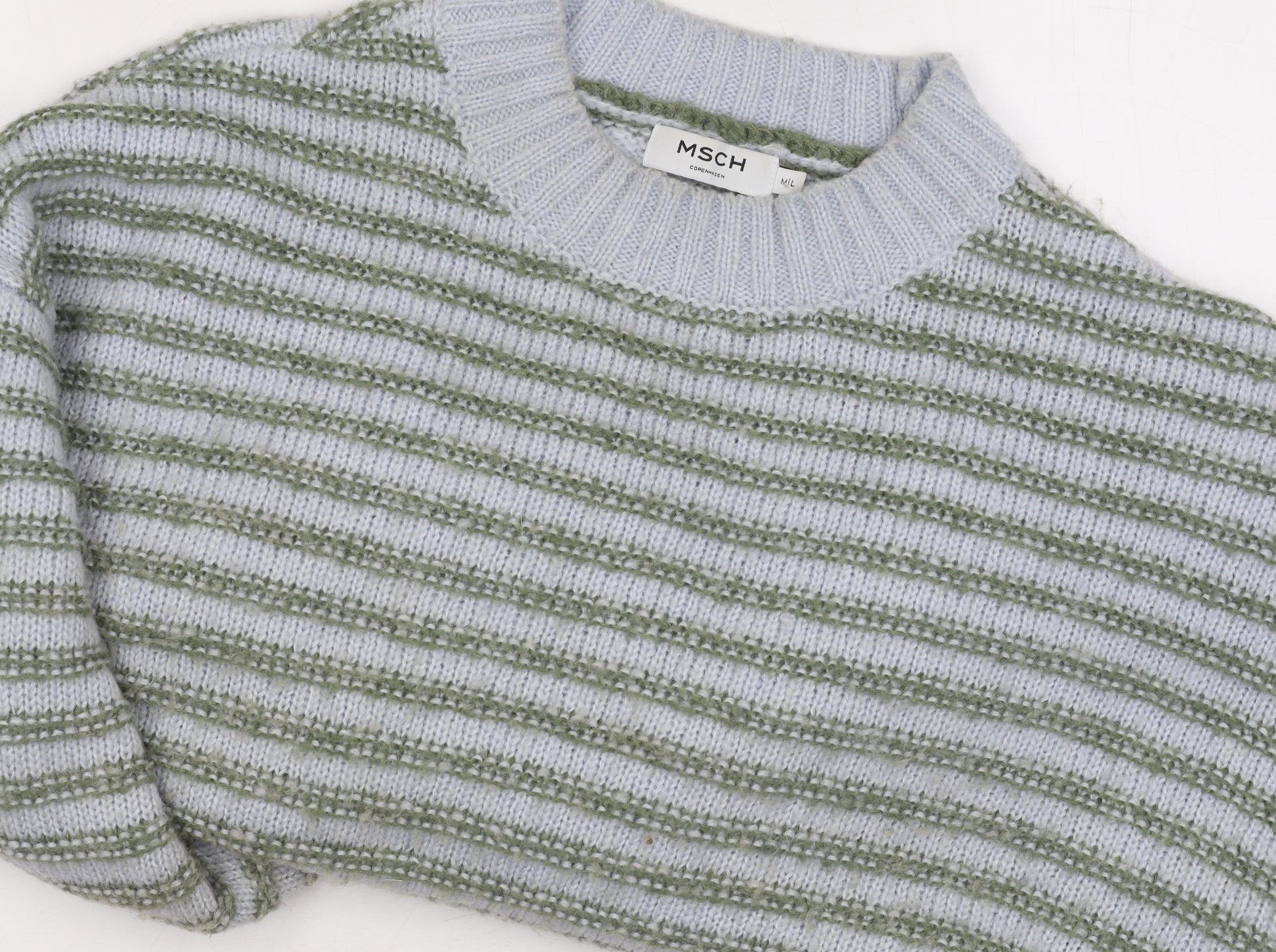 This MSCH women's pullover is a chic addition to any wardrobe, crafted in a size M for a comfortable, regular fit. Made entirely of wool, this knit jumper offers warmth and style for cooler days. The tight-knit fabric features a classic striped pattern in an appealing green shade, complemented by a crew neck design. Long sleeves make it perfect for layering over shirts or wearing alone for casual occasions. Though in excellent condition, minimal wear is visible, promising a lasting quality. Ideal for casual outings, this machine washable jumper offers both ease and elegance. Embrace simple scandinavian sophistication with a practical edge in this effortless piece.