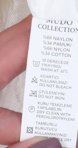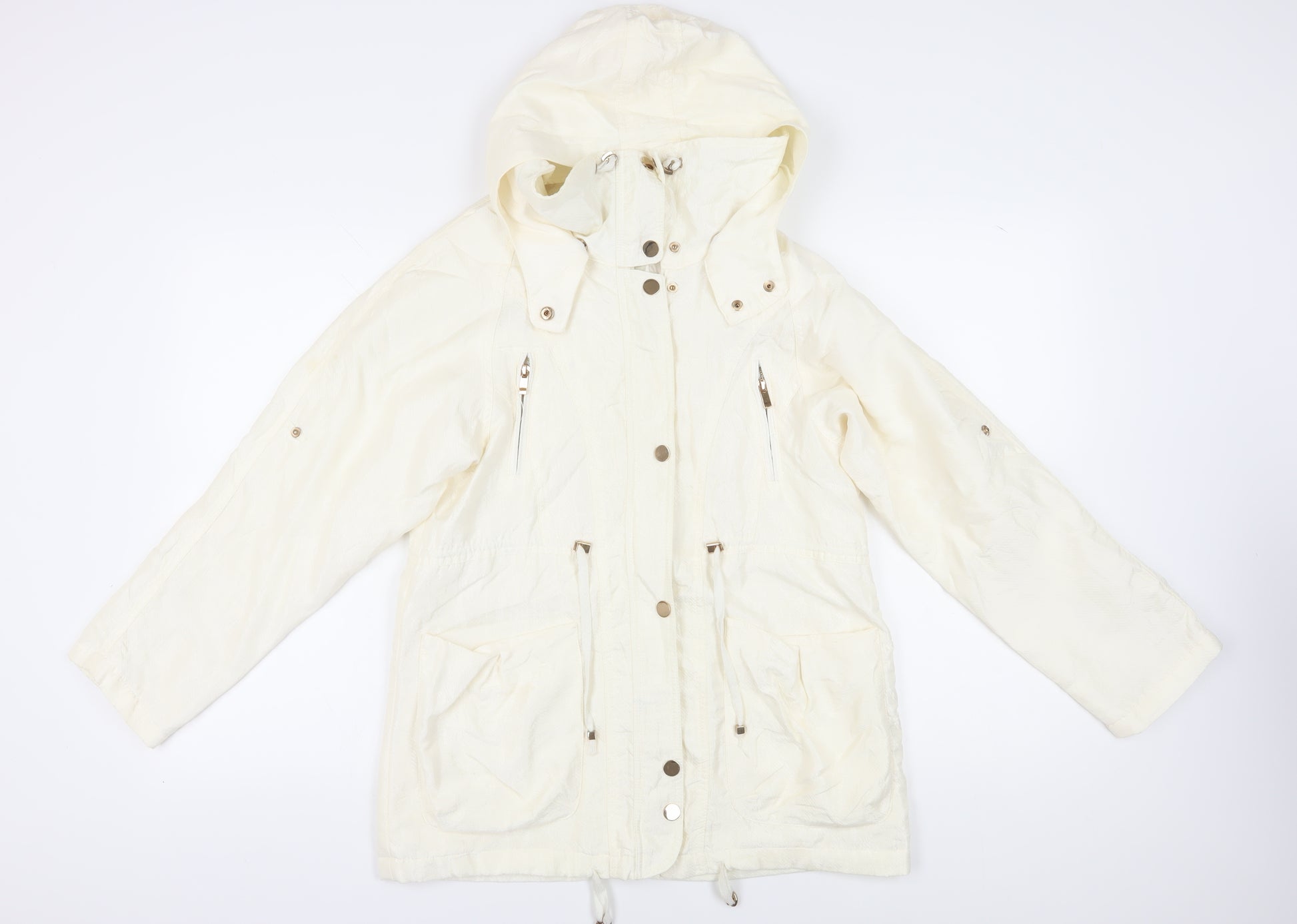 Elevate your outerwear collection with this chic Mudo Collection Women's Ivory Parka Jacket. Crafted from a luxurious blend of materials, the jacket combines 66% nylon and 34% cotton to offer a balance of durability and comfort. Designed in a stylish ivory hue, this versatile jacket is perfect for transitioning between seasons, effortlessly complementing any wardrobe choice. Featuring practical elements, such as a hood and pockets, this mid-length parka is both functional and fashionable. The jacket is equipped with a secure snap and zip closure, providing a snug fit against cooler breezes. Ideal for casual occasions, its regular fit makes it comfortable for layering over your favourite outfits. No matter the activity of the day, the Mudo Collection Parka ensures you stay stylish and cosy, embracing both elegance and practicality. Its excellent condition is marked by slight wear, promising continued wearability. Machine washable material ensures easy care and maintenance, making it a seamless addition to your everyday staples. Don't miss out on adding this statement piece to your collection.