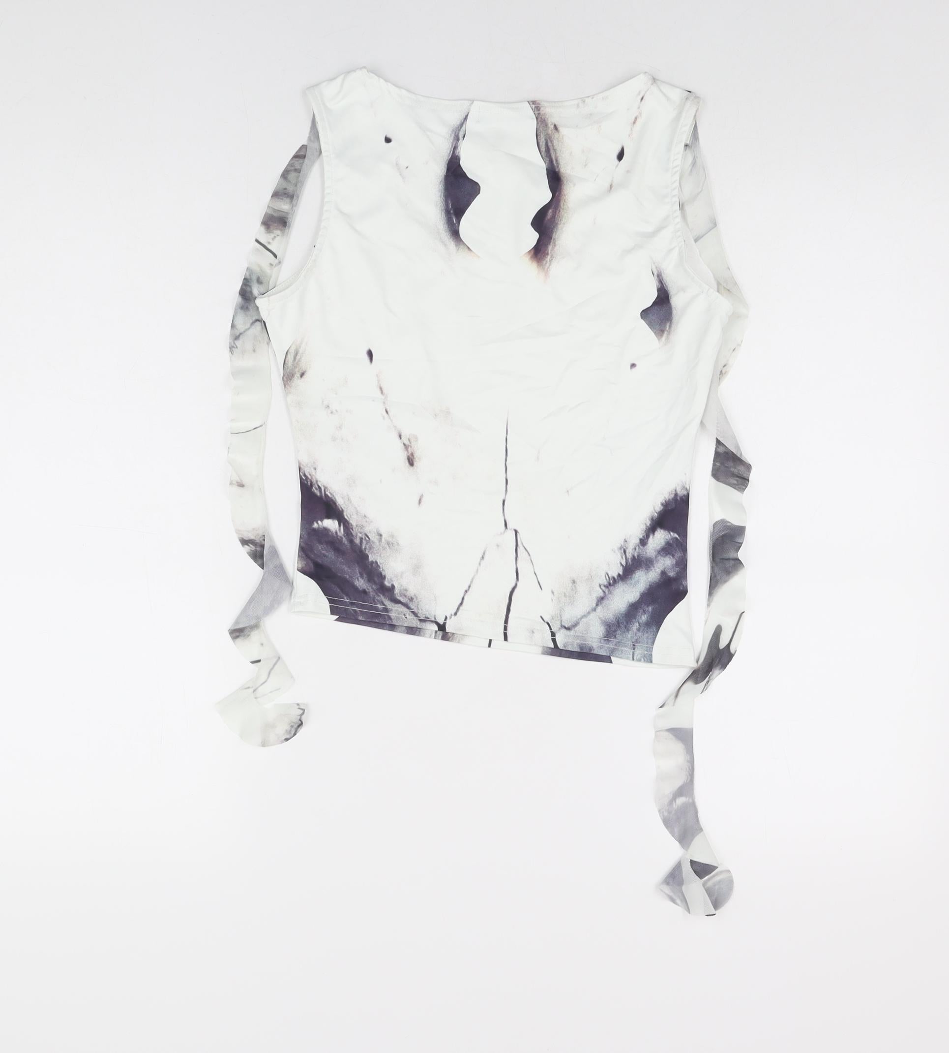Womens White Geometric Polyester Basic T-Shirt Size 10 Round Neck