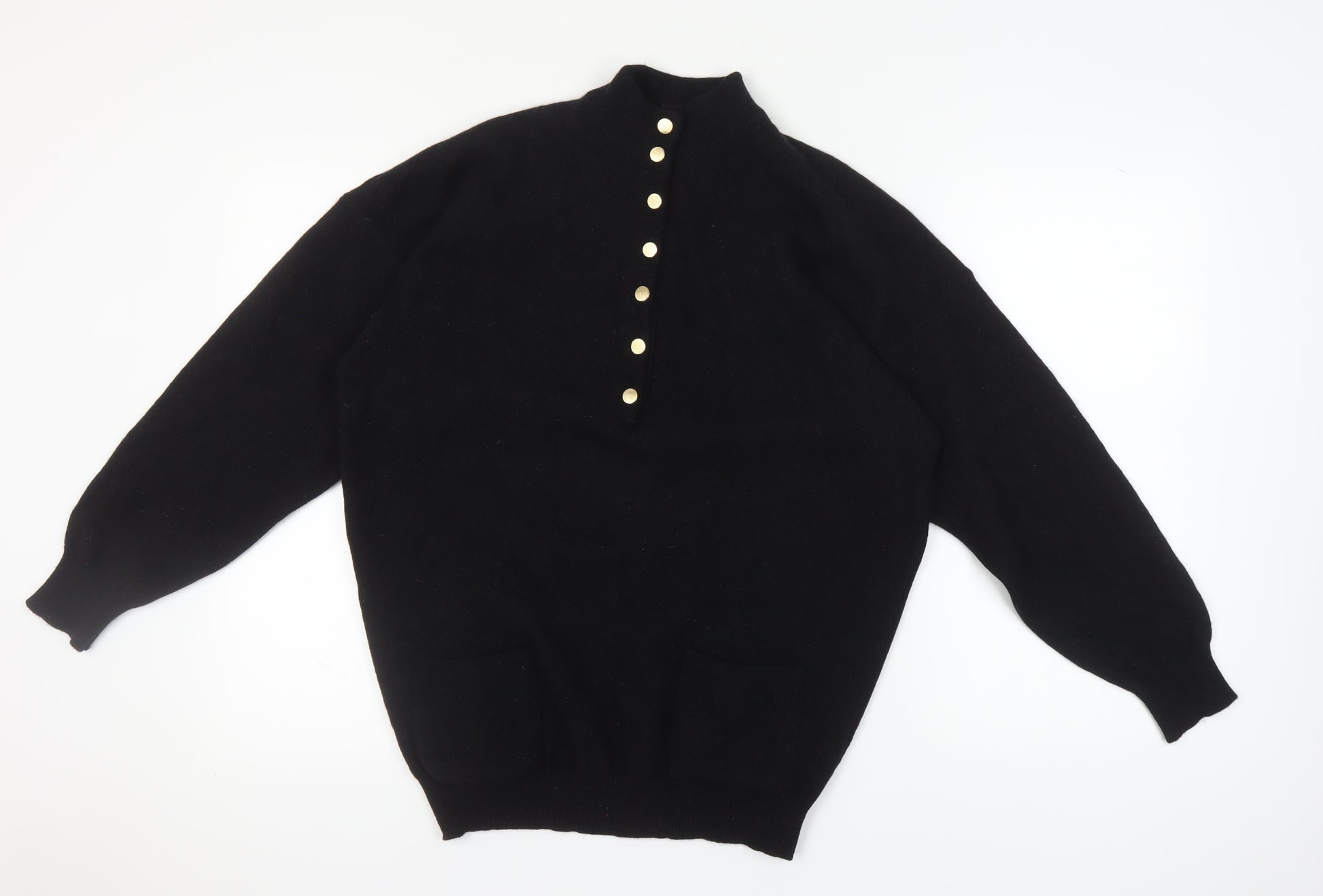 Upgrade your wardrobe with this elegant black jumper from Murray Brothers, crafted for women who appreciate both style and comfort. Designed with a sophisticated mock neck and long sleeves, this jumper promises to keep you warm while adding a touch of class to your outfit. Made in the UK, its high-quality blend of materials including wool, angora, and nylon combines durability with luxury, ensuring a soft and cozy feel against your skin. The jumper features distinctive button accents that enhance its timeless appeal. Ideal for casual outings or cozy evenings, this versatile piece can be easily paired with jeans or a skirt for effortless elegance. In excellent condition, this medium-sized jumper is a must-have addition to any fashion-forward wardrobe, offering both style and comfort in one chic package.
