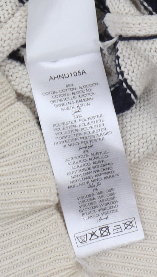 Elevate your wardrobe with this stylish NAF NAF Women's Ivory Striped Pullover Jumper, perfect for adding a touch of sophistication to your casual outfits. Crafted from a premium blend of cotton, polyester, acrylic, and viscose, this jumper offers both comfort and durability. The modern design features classic black stripes against a chic ivory background, creating an elegant yet casual look suitable for everyday wear. Highlighting a round neckline and long raglan sleeves, this jumper ensures a comfortable fit, while the button accents add a charming detail. Available in size M, it's designed for regular fit, making it a versatile piece that complements any wardrobe. Whether you're heading to a casual meet-up or enjoying a relaxed day out, this pullover is the ideal choice. Pair it with your favourite jeans or skirts for a complete look that exudes effortless style. Despite being pre-owned, it maintains its quality and aesthetic appeal, offering excellent value. Don't miss your chance to own this timeless piece from NAF NAF. Order now and step out in style!