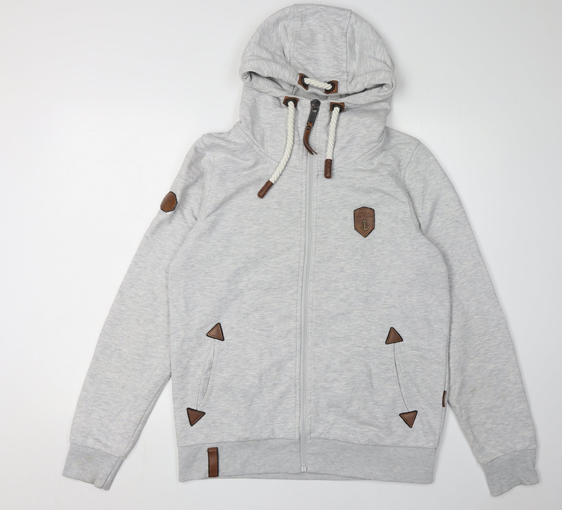 Elevate your casual wardrobe with this stylish Naketano Men's Grey Full Zip Hoodie. Designed in a comfortable regular fit, this hoodie is perfect for both autumn and winter seasons. Its high neck and hooded design provide extra warmth, making it ideal for chilly days. Crafted from a soft jersey fabric, it features a blend of 65% cotton and 35% polyester, ensuring durability and comfort. The hoodie includes practical pockets and a full zip closure for ease of use. Accented with the distinctive Naketano logo, it adds a touch of character to your everyday look. Machine washable for hassle-free maintenance, this grey hoodie is perfect for any casual outing. Pair it with jeans or joggers for a relaxed, yet in-style appearance. Despite being previously owned, it's in excellent condition without visible wear or tear, making it a worthy addition to your collection. Don't miss the chance to own this versatile and comfortable hoodie at an affordable price.