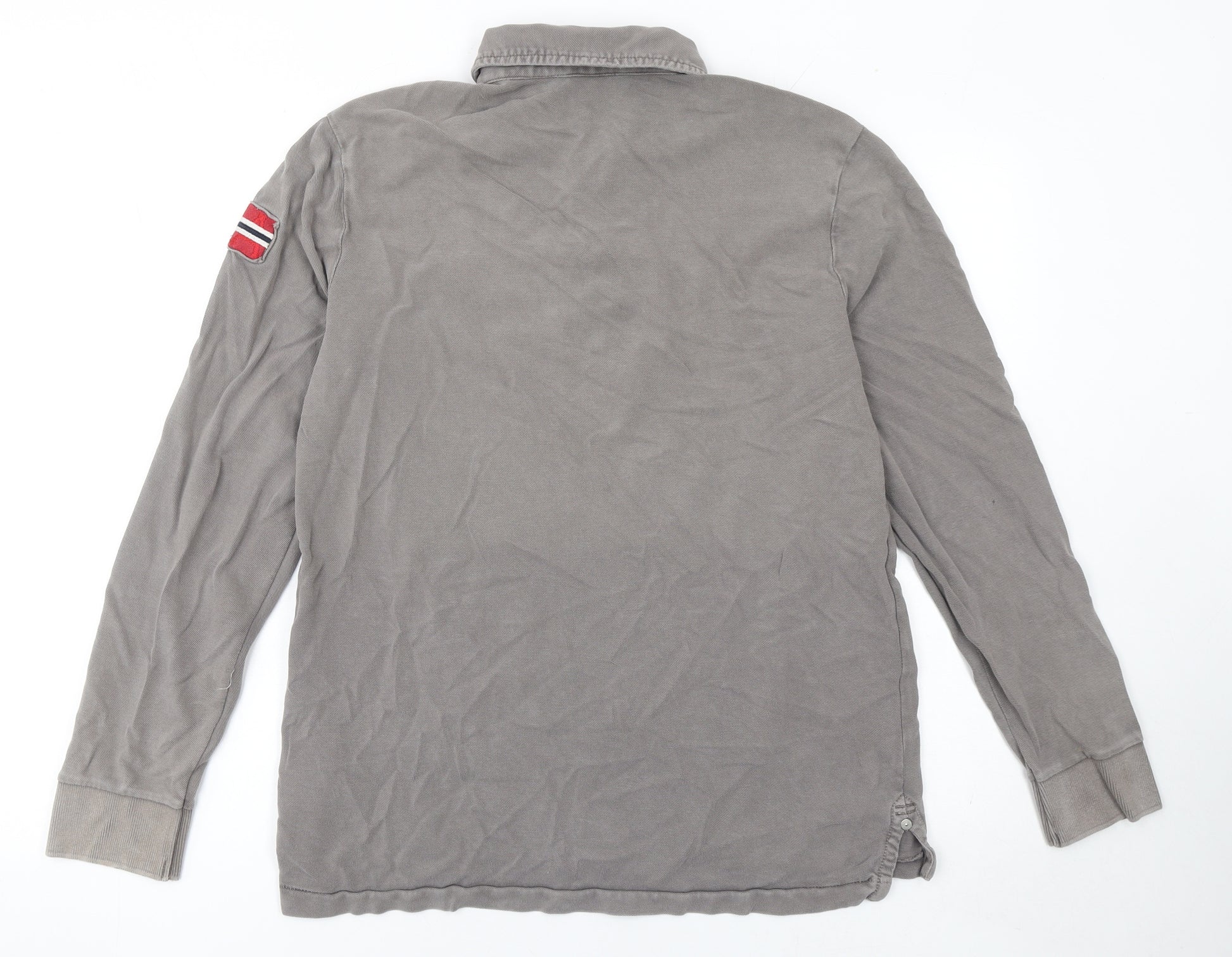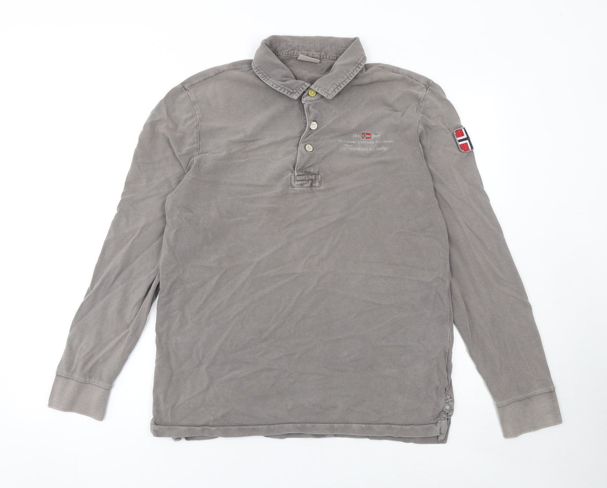 Add a touch of refined casual style to your wardrobe with this Napapijri men's grey long sleeve polo shirt. Crafted from 100% soft cotton, this polo offers the perfect balance between comfort and timeless design. The breathable cotton jersey fabric makes it an ideal choice for layering or wearing on its own, whether you're out for a casual weekend stroll or heading to a relaxed gathering. Designed in a versatile medium grey tone, this polo features a classic point collar and button placket, providing a smart, structured look without compromising on comfort. The embroidered Napapijri logo and distinctive Norwegian flag patch on the sleeve add a signature touch that reflects the brand’s outdoor and adventure heritage. The long sleeves are finished with ribbed cuffs for a secure, comfortable fit, while the structured yet flexible cotton fabric ensures durability and longevity. This piece is machine washable and easy to care for. Its simple and stylish solid colour design makes it suitable for a range of occasions from casual Fridays at work to weekend leisurewear. The regular fit allows easy movement and a flattering silhouette for most body types. Pair it effortlessly with jeans, chinos, or shorts to achieve a laid-back, contemporary style that conveys confidence and quality craftsmanship. Though pre-owned, this shirt remains in very good condition with only light signs of wear visible, maintaining its softness and shape. Offering excellent value, this Napapijri polo is a must-own for anyone seeking an authentic, versatile, and durable wardrobe staple. Perfect for cooler seasons such as autumn and spring, it makes a great choice for layering under jackets or over T-shirts while maintaining an effortlessly polished look. A wardrobe essential for the modern man who appreciates comfort, function, and understated style.