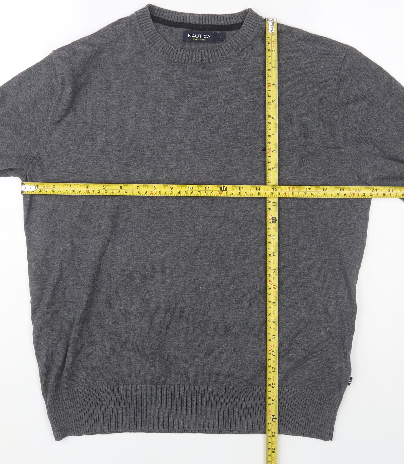 Elevate your wardrobe with this Nautica men's grey cotton pullover jumper, designed for both comfort and timeless style. Crafted from 100% soft cotton, this crew neck jumper offers breathable all-season wear that is ideal for layering or standalone use. The refined grey tone and minimalist design make it a versatile piece suited for casual and smart-casual settings alike. Featuring the iconic Nautica embroidered logo on the chest, this jumper subtly reflects the brand's nautical-inspired elegance and commitment to quality craftsmanship. The fine tight-knit texture gives it a smooth finish, while ribbed trims at the neckline, cuffs, and hem ensure a neat fit and maintain the garment’s shape over time. The lightweight cotton fabric allows for comfort during transitional seasons like spring and autumn, yet offers enough warmth for layering in winter. Its regular fit provides ease of movement and a flattering silhouette that complements various builds. Perfect for pairing with jeans, chinos, or even under a blazer, it’s a wardrobe staple for men who appreciate understated sophistication. The jumper is in excellent pre-owned condition with only light general wear, reflecting careful previous use and maintaining its structural integrity. Ideal for everyday wear, travel, or relaxed business-casual occasions, this Nautica jumper offers excellent value and enduring appeal. Hand wash care ensures its material quality and lasting softness. Whether you're heading out for a brisk walk, a relaxed weekend outing, or an informal evening gathering, this stylish and practical piece embodies effortless refinement. Add this classic Nautica cotton crew neck jumper to your collection to enjoy timeless comfort, versatile styling, and a confident, casual look that never goes out of fashion.