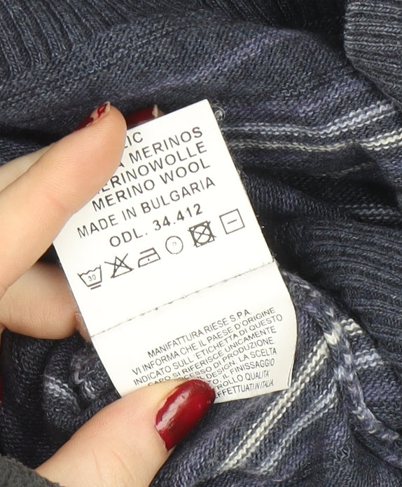 This Navigare Sport men's jumper combines cool-weather comfort with a refined, casual style. Crafted from 100% premium merino wool, the jumper provides superb warmth while maintaining a lightweight and breathable feel, making it ideal for layering throughout autumn and winter. The blue striped pattern gives a classic look that pairs effortlessly with jeans, chinos or casual trousers for relaxed weekends or smart-casual occasions.Designed in a comfortable regular fit, this XL jumper comes with a high neck and a half-zip closure, offering versatility to adjust your comfort level as needed. Its ribbed cuffs and hem add shape retention and a subtle sporty edge. The fine knit construction ensures the jumper maintains a sleek silhouette, while the merino wool's natural temperature-regulating properties help keep you cosy without overheating.Although lightly pre-loved, this piece remains in very good condition, showing only minimal bobbling typical of natural wool fibres. The craftsmanship reflects Navigare’s commitment to quality and timeless Italian-inspired style. Perfect for layering over a crisp shirt for a smart casual look or wearing on its own for relaxed style days.Versatile and easy to care for, this jumper is machine washable on a gentle cycle, making it as practical as it is stylish. Whether you're heading out for a walk, gathering with friends, or simply relaxing at home, this Navigare jumper ensures comfort and understated sophistication.An essential addition to any man’s wardrobe, this half-zip merino wool jumper is the perfect balance between warmth, breathability, and classic elegance. Its durable make and soft touch will make it a go-to piece for seasons to come.