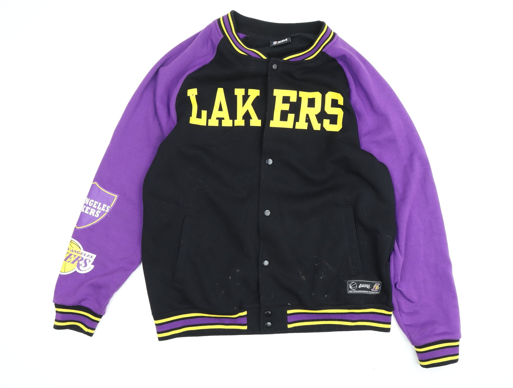 Showcase your team spirit with this stylish NBA Varsity Jacket. Designed in a classic black and purple colourway, this men's jacket is perfect for the avid sports fan. Crafted from high-quality cotton, it ensures comfort and breathability, making it ideal for casual outings in autumn and spring. This 2XL jacket features a stand-up collar style, with convenient pockets and a secure button closure for everyday functionality. Embrace a sporty theme with logo accents that add a distinctive flair to your wardrobe. Whether you're heading to a game or enjoying a laid-back day out, this varsity jacket complements your casual style while keeping you warm with its mid-length fit. Easy to care for, it's machine washable, making maintenance a breeze. Don't miss the chance to add this versatile piece to your collection and sport your love for basketball in a unique way. Perfect for those seeking a blend of style, comfort, and team allegiance. Grab yours now at an unbeatable price!