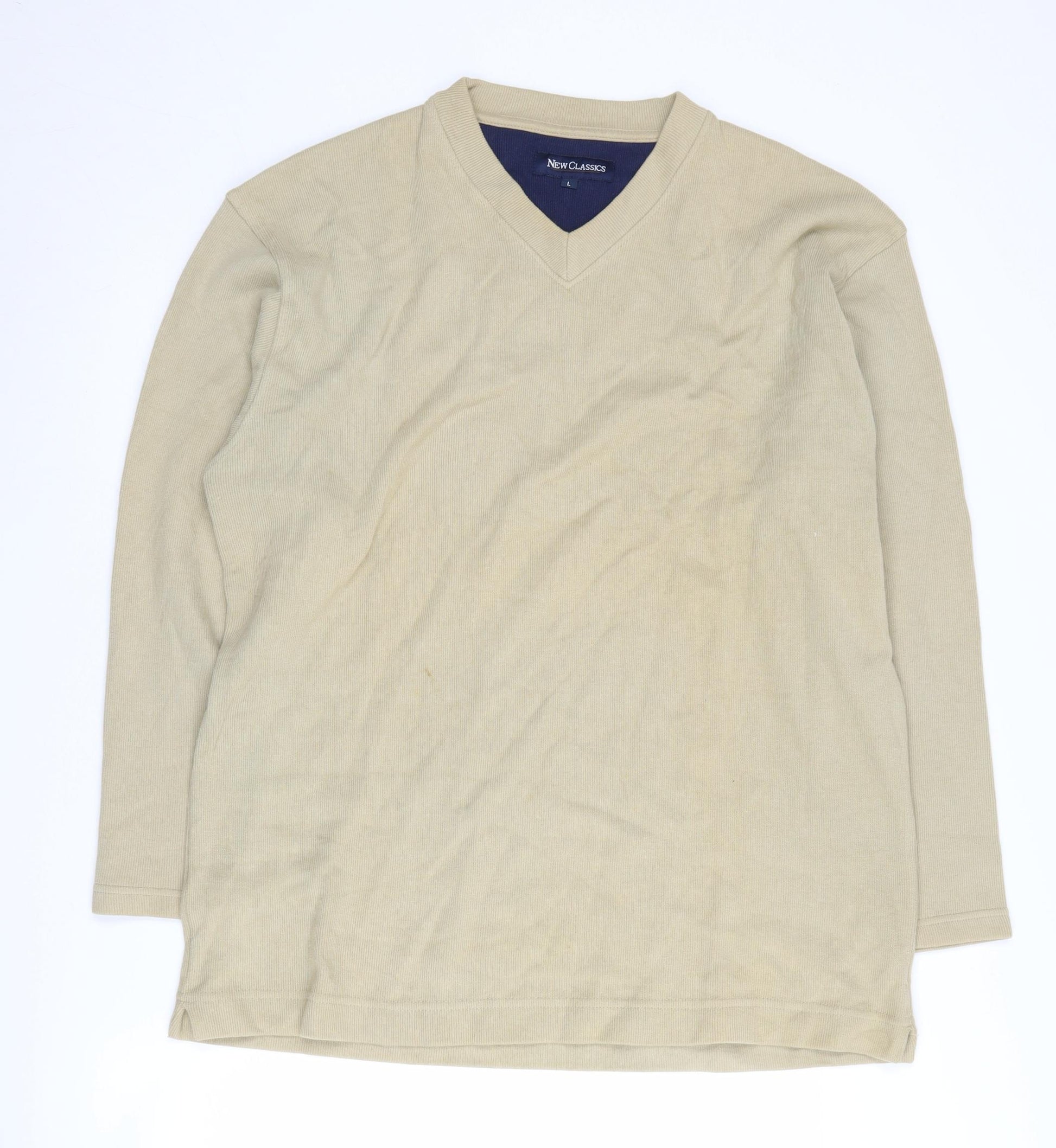 Step up your wardrobe with this elegant beige pullover from New Classics. Crafted from 100% premium cotton, this jumper guarantees comfort and breathability, making it an excellent choice for all seasons. Designed with a classic V-neckline and regular fit, it offers a timeless style that seamlessly integrates into any modern man's wardrobe. Versatile and perfect for casual occasions, this pullover pairs effortlessly with jeans or trousers for both laid-back and semi-formal settings.Featuring long sleeves and a neat knit fabric, it promises warmth without compromising on style. Though it presents a minor stain on the front, it remains in very good condition, adding authentic character to this wardrobe staple. Easy to maintain, this machine washable piece ensures practicality and longevity, promising to stay a favourite for many seasons to come. Ideal for those who appreciate subtle elegance and reliable comfort, this New Classics jumper is a must-have addition to your collection. Available in size L, it provides a comfortable fit that complements various body shapes and sizes.
