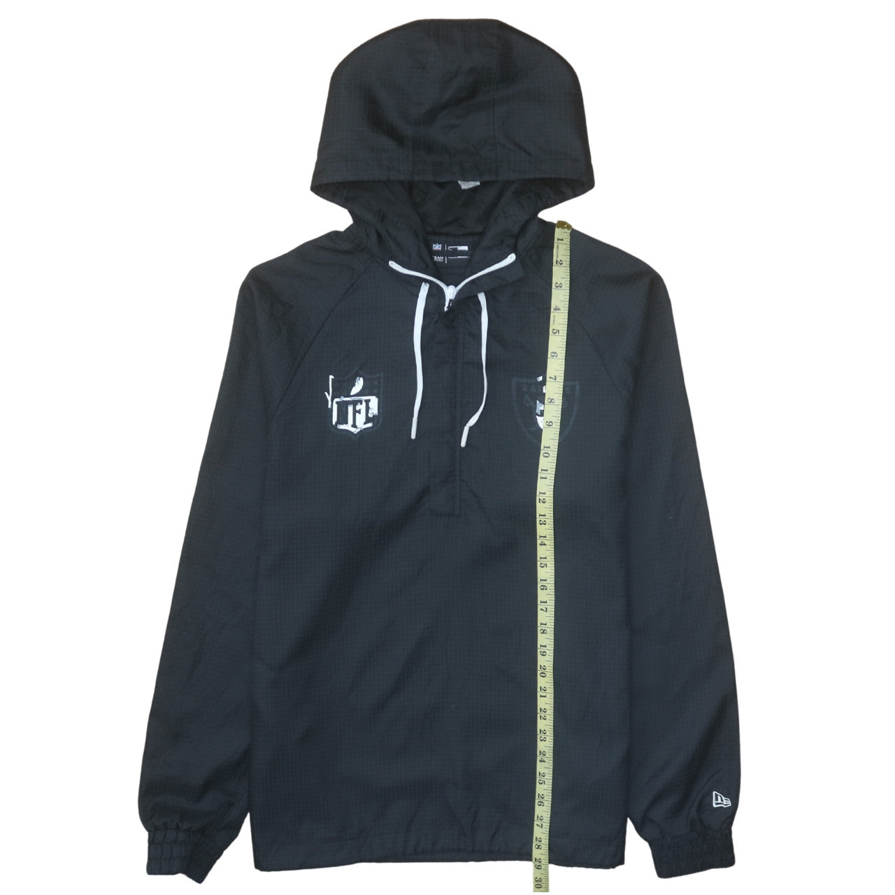 Stay sleek and comfortable with this officially licensed New Era NFL Raiders men’s windbreaker jacket, designed for the ultimate mix of sporty function and casual streetwear style. Crafted from a lightweight blend of 80% nylon and 20% polyester, this mid-length jacket offers breathability and durability while being easy to move around in. The pullover design keeps things simple and practical, with an adjustable drawstring hood adding versatility for different weather conditions.This jacket features iconic Raiders branding at the chest, making it a great choice for fans of American Football or anyone who appreciates athletic-inspired looks. With a regular fit and elasticated hem and cuffs, it sits comfortably on the body while maintaining a clean silhouette. The polyester and mesh lining enhances ventilation during workouts or casual daily wear, making it ideal for activities like running, gym training, and outdoor sports.Functional features like its hooded design, lightweight fabric, and easy-care construction make this jacket convenient for everyday use, whether you’re heading to a game, commuting, or just keeping active. In classic black, it combines effortlessly with jeans, joggers, or shorts for a versatile edge to any outfit.This New Era windbreaker is part of the much-loved Team Apparel line, ensuring authentic quality with a durable build. The condition is excellent, showing only minimal signs of wear, ready for a new owner to enjoy. Ideal for spring or autumn seasons, its timeless design and Raiders logo add attitude and heritage to your wardrobe. A stylish piece of sportswear that keeps you comfortable, active, and looking sharp every time you put it on.