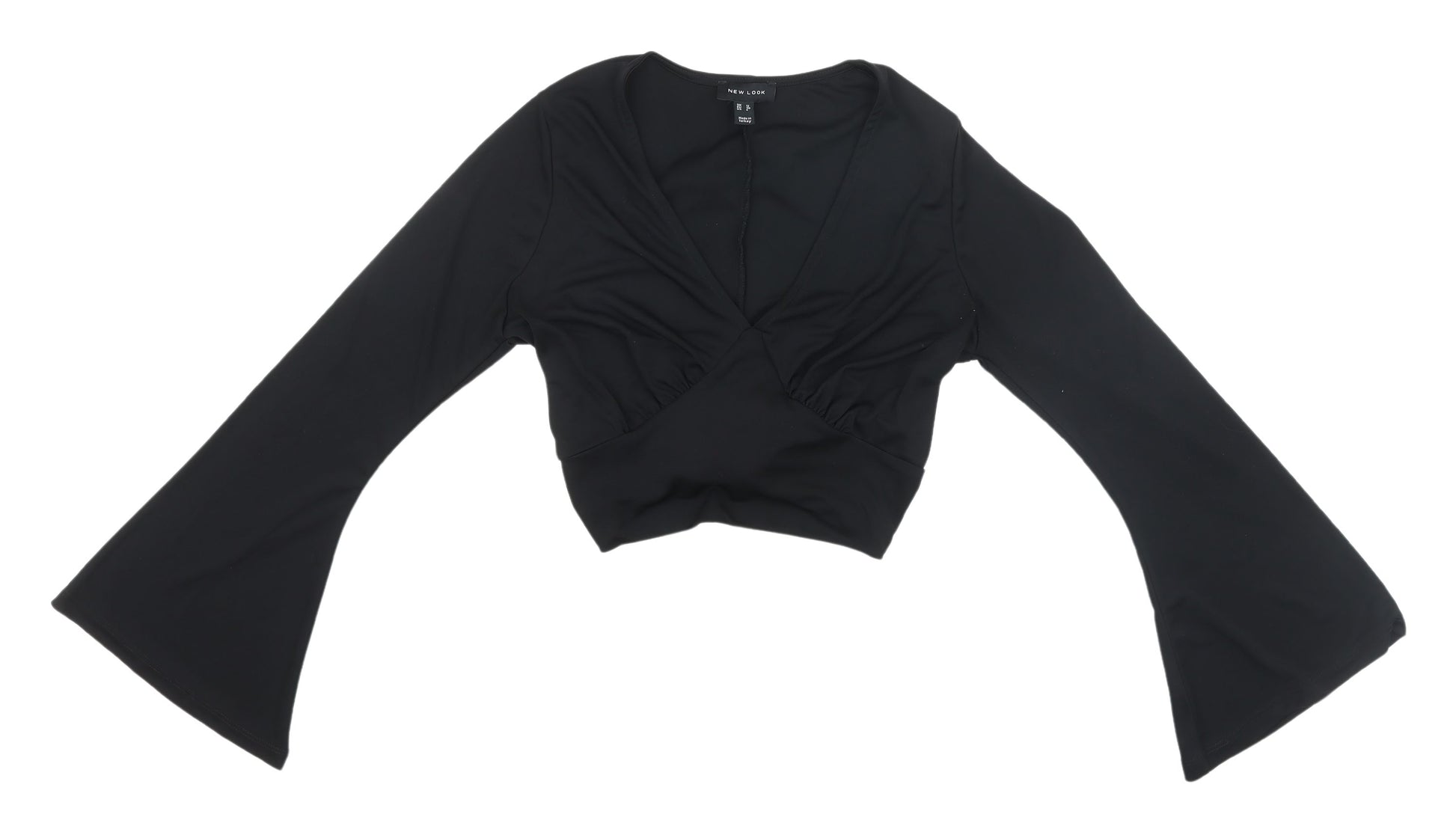 Embrace chic simplicity with this black cropped blouse from New Look, designed for the modern woman who appreciates a touch of flair. Perfect for casual outings or as the statement piece for a party, this blouse combines comfort and style effortlessly. The long, flared sleeves provide a dramatic silhouette, adding volume and interest to the classic shape. Crafted entirely from polyester, it offers lightweight wear and easy maintenance, ensuring it remains a staple in your wardrobe for seasons to come. The flattering V-neckline accentuates the collarbone, offering an elegant and feminine touch that pairs well with both jeans and skirts. A tie accent adds a playful finish, giving you the flexibility to style it as you wish. Ideal for autumn, spring, and summer wear, this blouse is as versatile as it is fashionable. Transition seamlessly from a day at the office to an evening with friends while making a statement with this subtly stunning piece. Experience the ease of machine washability which ensures your top stays in pristine condition no matter where your day takes you. New with tags, this blouse is in perfect condition, representing excellent value. Whether heading to a casual event or a cocktail party, be sure to stand out with this elegant and sophisticated piece from New Look.