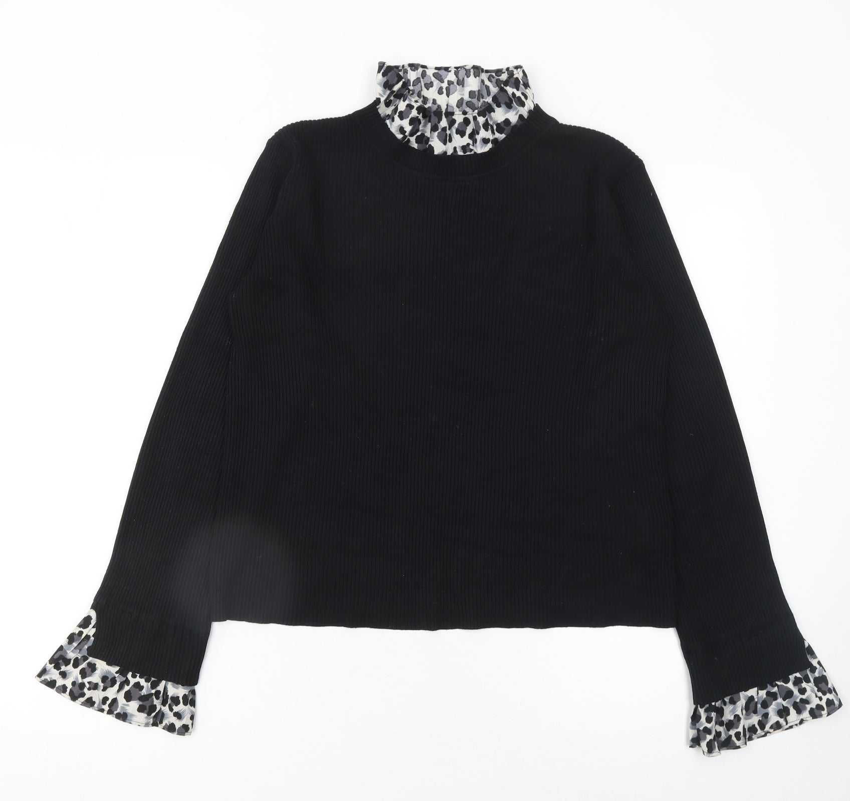 Elevate your everyday wardrobe with this chic New Look women’s black jumper featuring a stylish leopard print trim. Designed in a comfortable pullover style, this jumper showcases a mock neck and long sleeves, adorned with flared cuffs that add a feminine flair. The body is constructed in a soft ribbed knit fabric crafted from a viscose and polyamide blend, ensuring both comfort and flexibility for all-day wear. The contrasting black knit and animal print ruffle trim bring modern sophistication with a playful edge, giving this piece a unique twist perfect for casual or semi-formal occasions. The jumper’s regular fit flatters the figure while allowing easy movement, and its tight-knit texture makes it an ideal layering piece for cooler months, ensuring warmth without bulk. Perfectly suited for autumn and winter, this jumper pairs beautifully with jeans, tailored trousers, or a sleek skirt for a polished yet effortless look. The lightweight knit ensures a breathable finish, keeping you comfortable indoors or out. Although in good pre-loved condition, please note a light mark on one sleeve trim, which is minor and does not detract from the overall appeal or wearability. Made to embody modern casual elegance, this piece is versatile enough to complement multiple styles—perfect for layering under coats or pairing with boots for a contemporary outfit. Choose this New Look jumper for that blend of comfort, knit-textured charm, and fashionable animal print detailing—a practical yet stylish addition to any collection, balancing warmth with flair.