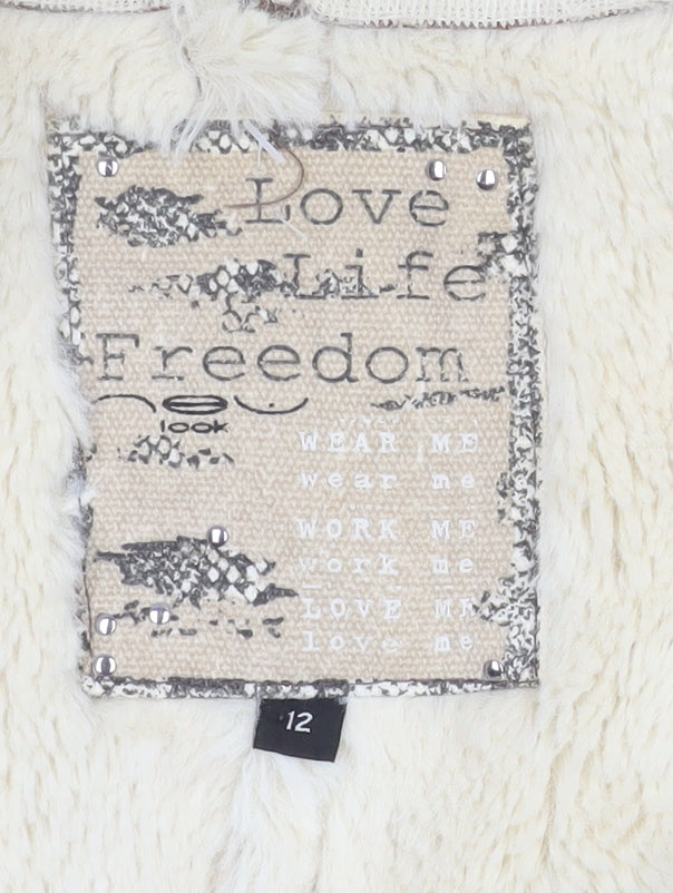 Wrap yourself in cosy style with this chic New Look Women’s faux shearling jacket in size 12. Designed in a rich brown tone with a cream faux fur lining, this jacket provides a perfect blend of comfort and effortless fashion. The soft polyester faux suede outer shell contrasts beautifully with the plush inner lining, giving a look that feels both stylish and snug. Ideal for autumn and winter, this open-front jacket drapes naturally and layers well over casual outfits. The design features long sleeves and an asymmetric cut for added shape and an easy, laid-back feel. The lined interior ensures warmth without bulk, making it perfect for chilly days when you want to stay comfortable but still look refined. Finished with faux fur trim detail, it brings a touch of bohemian-inspired texture that complements jeans, dresses, and boots alike. This short-length jacket has a relaxed fit which flatters various body types and enhances movement, providing that ‘throw-on-and-go’ ease perfect for everyday wear. In excellent pre-loved condition, it shows minimal signs of wear and no visible defects, maintaining its softness and structure. It’s machine washable for easy care and great for cold-weather layering. Whether heading out for a casual workday, a weekend event, or an evening stroll, this jacket’s timeless colour palette and cosy design make it a wardrobe essential. Warm, stylish, and made with the quality style you expect from New Look, this faux shearling piece is sure to become a go-to favourite through the cooler months. Make every outfit effortlessly standout with this versatile piece that combines modern fashion and cosy comfort at its best. Perfect for completing a casual yet polished seasonal look.