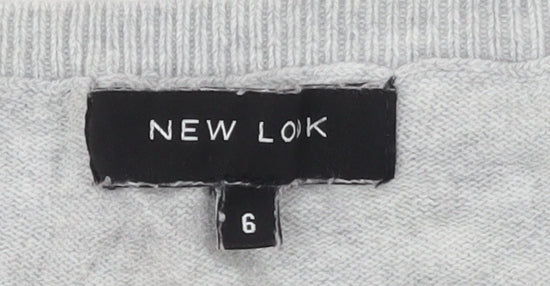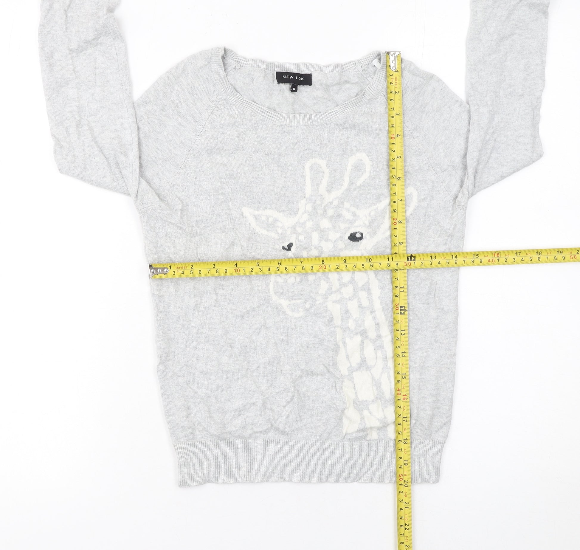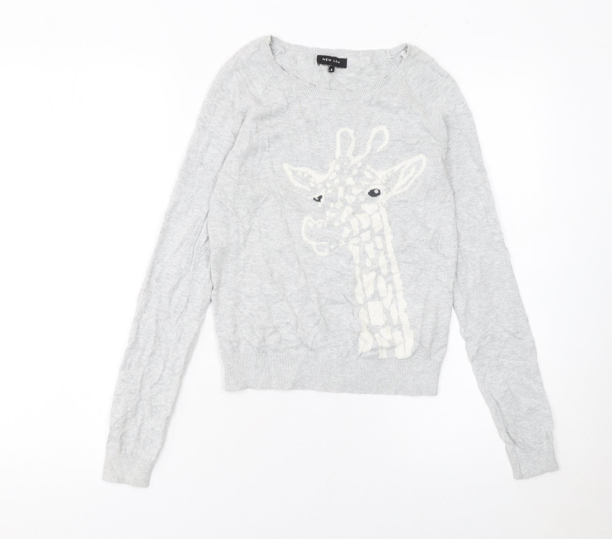 Add a playful touch to your wardrobe with this charming grey jumper from New Look, designed exclusively for women who love effortless style and comfort. Crafted from 100% cotton, this super-soft knit offers breathable wear that keeps you cosy during cooler months while remaining lightweight enough for layering through autumn and winter. The jumper features a delightful giraffe design across the front, giving it a fun and standout animal-themed appearance that’s perfect for casual or relaxed settings.The crew neckline and long raglan sleeves provide a classic silhouette, complemented by ribbed cuffs and hemline for a comfortable, stay-put fit. Its tight-knit cotton fabric ensures a smooth texture and quality feel, ideal for pairing with jeans, skirts or casual trousers for everyday wear. The embroidered animal motif brings a playful character to your outfit, making it an effortless conversation starter while maintaining versatile colour tones that go perfectly with multiple wardrobe staples.In a flattering size 6 fit, this jumper sits comfortably on the body without feeling restrictive, offering a regular fit with a timeless appeal. Its clean grey hue enhances its adaptability, allowing for easy styling across seasons. This piece is machine washable, making it as practical as it is stylish. Although pre-owned, it remains in excellent condition with only slight creasing visible, showing minimal signs of wear.Perfect for casual occasions, this New Look cotton jumper combines style, quality and comfort at an affordable price, offering a fashionable yet relaxed look that’s easy to love. Ideal for laid-back weekends, cosy nights in, or everyday wear, it’s a wardrobe essential with a hint of personality. Treat yourself to this charming giraffe print jumper and enjoy a touch of fun combined with classic British high-street style.