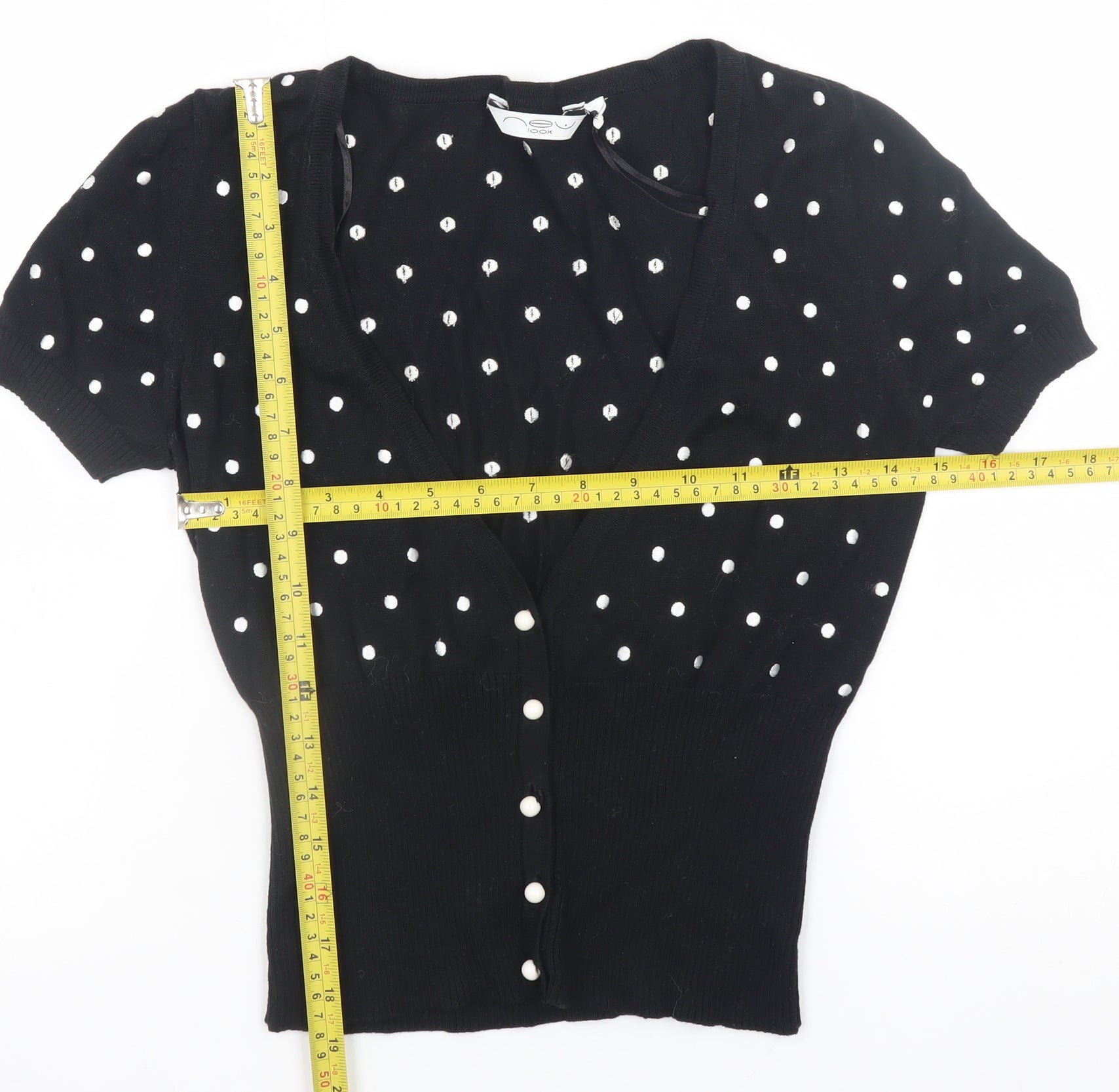Refresh your everyday wardrobe with this charming New Look women’s black cropped top, crafted from soft 100% cotton knit for breathable comfort and effortless style. Designed with short sleeves and a flattering V-neckline, this lightweight button-up features a timeless black base adorned with playful white polka dots, exuding both retro charm and modern femininity. The ribbed waistline and cuffs ensure a comfortable, figure-skimming fit that enhances your natural silhouette while maintaining ease of movement. The cropped cut makes it perfect for pairing with high-waisted jeans, skirts, or shorts, creating a stylish and versatile look suitable for any warm-weather occasion. The simple button closure adds a touch of classic detailing, while the cotton knit fabric provides softness and structure for all-day wear. Perfect for casual outings, relaxed weekends, or dressing up with accessories for a chic day-to-night ensemble. Its solid craftsmanship and breathable natural material ensure lasting wear, making it a wardrobe staple you’ll reach for again and again. In excellent pre-loved condition, showing light signs of gentle use with no visible defects or damage. Easy to care for, this short sleeve top is machine washable and designed to hold its shape wash after wash. Ideal for spring and summer, it combines comfort, timeless design, and practicality in one must-have piece. Add this stylish polka dot button-up cropped cotton top by New Look to your collection for a fun yet sophisticated addition that never goes out of fashion. A perfect blend of simplicity and charm, ready to elevate your seasonal style.