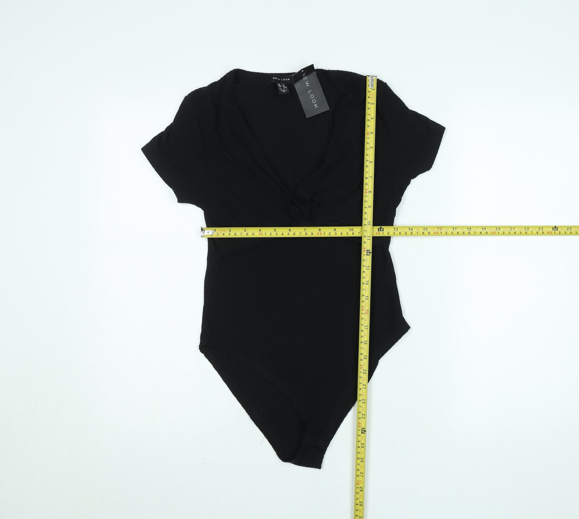 Add an essential staple to your wardrobe with this sleek and stylish black bodysuit from New Look. Designed for women, this flattering one-piece features a deep V-neckline with a subtle twist front detail, creating a chic yet minimalist look perfect for any occasion. The short sleeves and body-hugging fit make it an ideal layering piece for both day and evening outfits.Crafted from a smooth stretch jersey fabric made of 96% polyester and 4% elastane, this bodysuit offers both comfort and flexibility, ensuring a perfect fit that moves with you. The lightweight, soft-touch material makes it breathable and ideal for warmer seasons like spring and summer. With a snap closure at the base for practicality, this design combines everyday wearability with effortless style.The bodysuit’s contemporary cut allows it to be paired with high-waisted jeans, a midi skirt, or tailored trousers for a refined, put-together outfit. Its understated design makes it suitable for both casual outings and more dressy occasions — perfect for pairing with statement jewellery or a blazer for a chic evening look. The black hue ensures maximum versatility, easily coordinating with a variety of colours and patterns in your wardrobe.New Look’s attention to detail is reflected in the ribbed jersey texture that subtly enhances the bodysuit’s visual appeal while maintaining a smooth silhouette. Designed to keep you comfortable throughout the day, it’s machine washable for easy care and long-lasting wear.Perfect for those who appreciate a combination of comfort and style, this New Look black bodysuit is a must-have base for smart casual dressing, offering timeless elegance in a modern, feminine form. Whether layered or worn solo, it’s a wardrobe essential that elevates even the simplest ensemble.