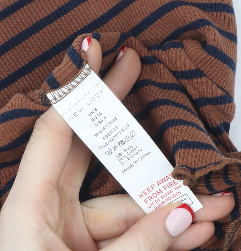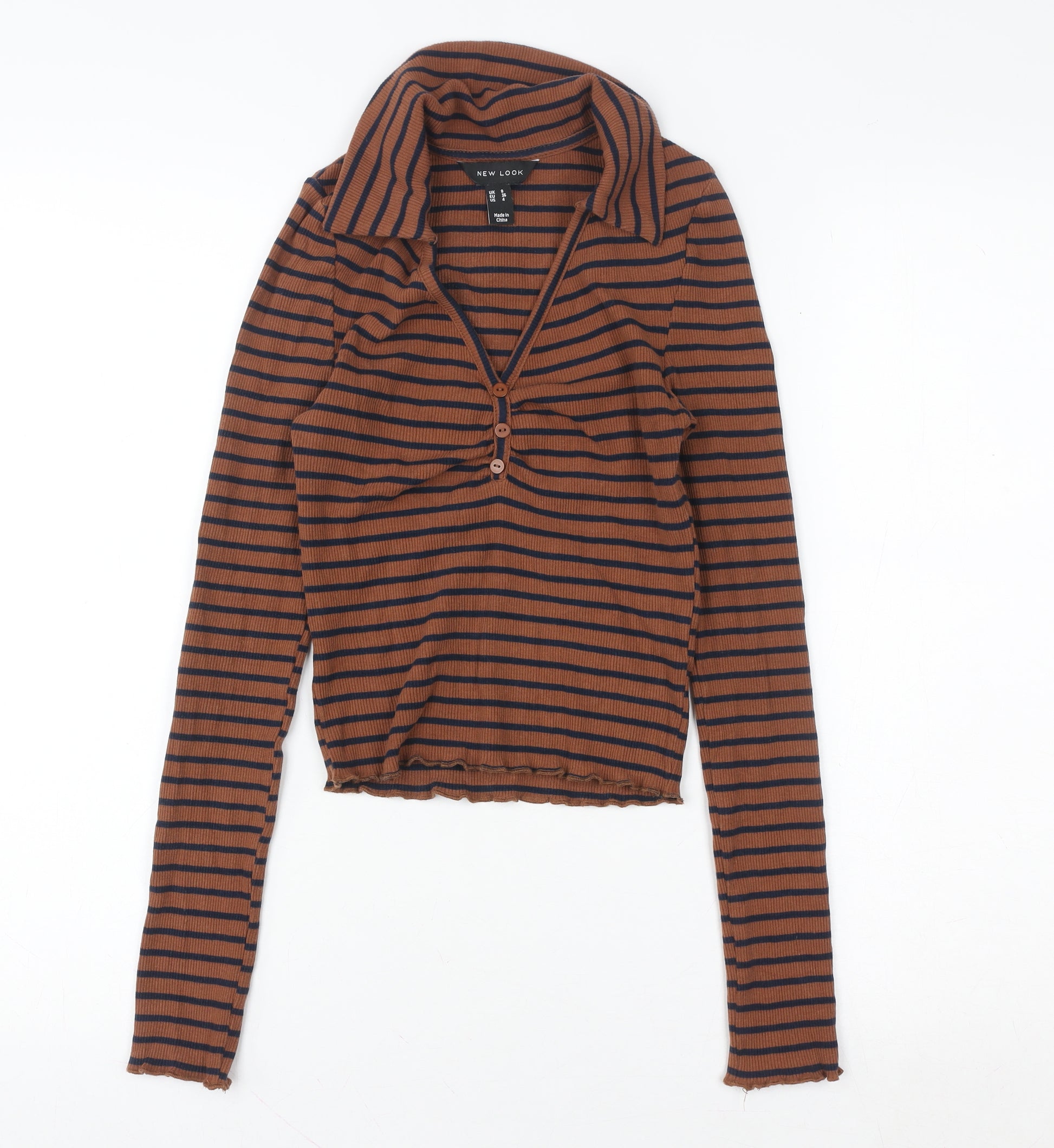 Step into effortless casual style with this New Look women’s long sleeve cropped top in size 8. Crafted from a soft ribbed knit fabric, the top features a warm brown base enhanced by subtle navy stripes, creating a timeless striped pattern that adds a modern yet classic appeal to your everyday wardrobe. The collared neckline with a short button placket gives it a smart-casual edge, perfect for styling up or down depending on the occasion. Made from a comfortable and breathable cotton and elastane blend, this top offers a natural stretch for a flattering slim fit that stays comfortable all day. The cropped hemline gives it a trendy finish, ideal for pairing with high-waisted jeans, skirts, or trousers. Designed with full-length fitted sleeves, it’s an ideal layering piece for cooler months or a statement top on its own during spring days. The fabric’s ribbed texture adds extra character, while the brown and navy colour palette ensures it matches easily with neutral tones or denim. This piece is great for casual wear, coffee dates, or creating that effortlessly chic everyday look. The top is in excellent used condition, showing minimal signs of wear with no visible flaws, ensuring it looks clean and well cared for. Machine washable for easy maintenance, it combines practicality with versatile style. Whether you’re after a go-to top for layering or something simple yet polished for daily wear, this New Look striped collared cropped top is a fantastic wardrobe essential that balances comfort, form, and subtle fashion-forward design.