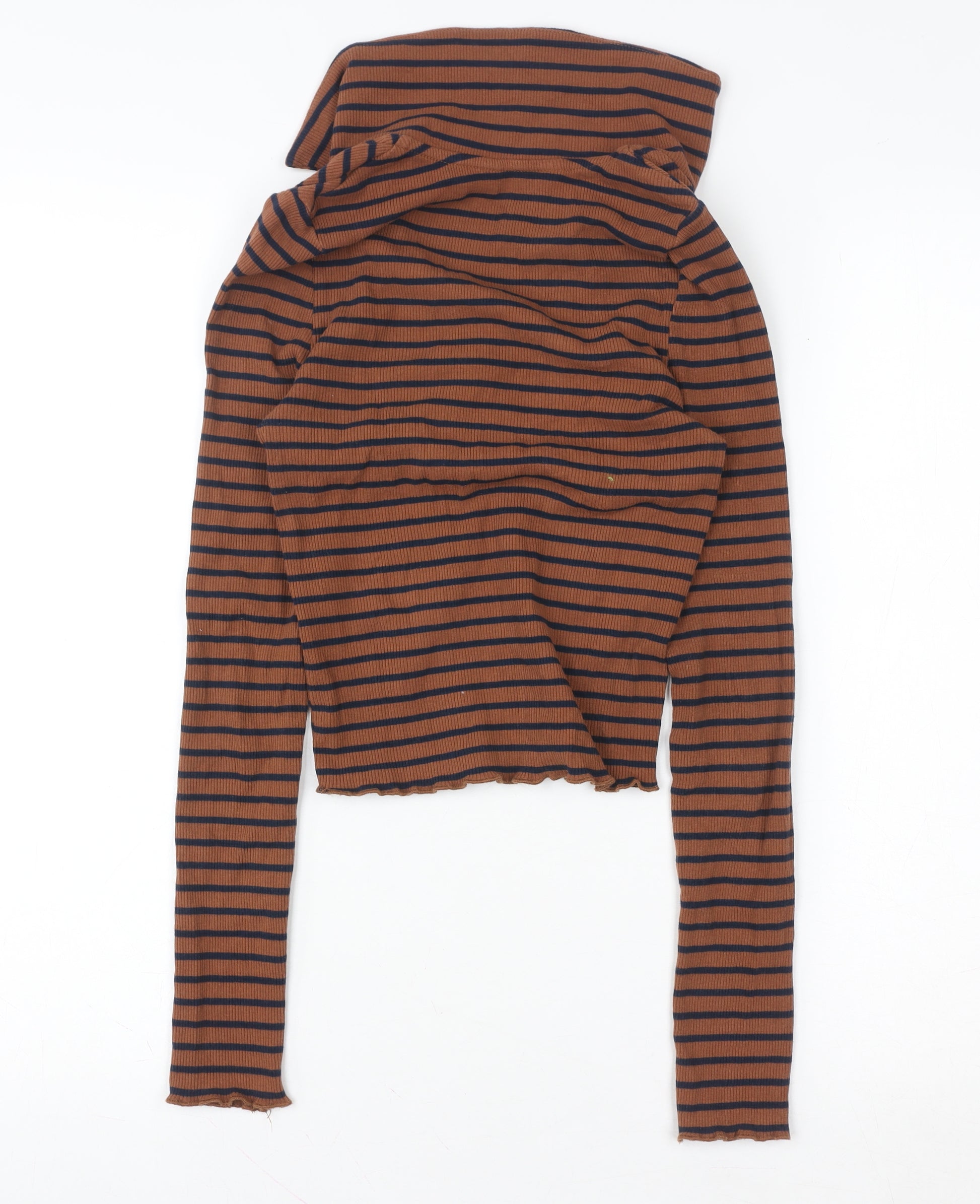 Women’s Brown Striped Collared Cropped Long Sleeve Top Size 8