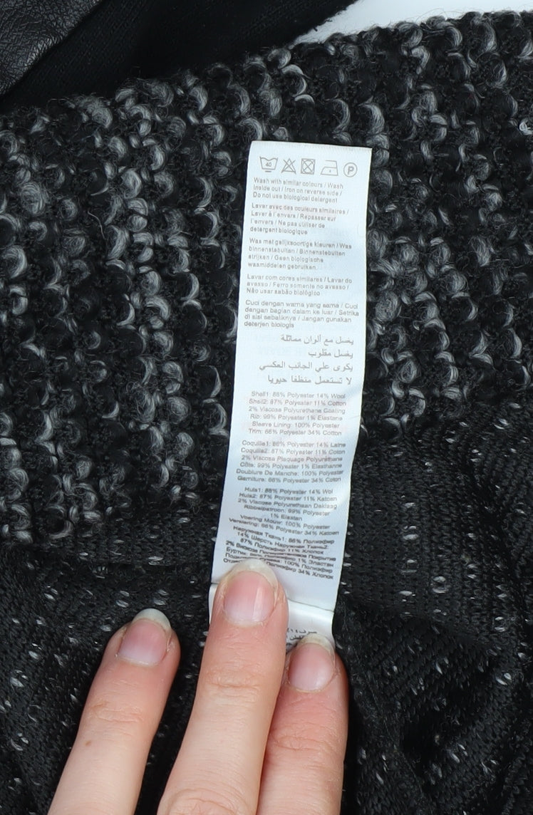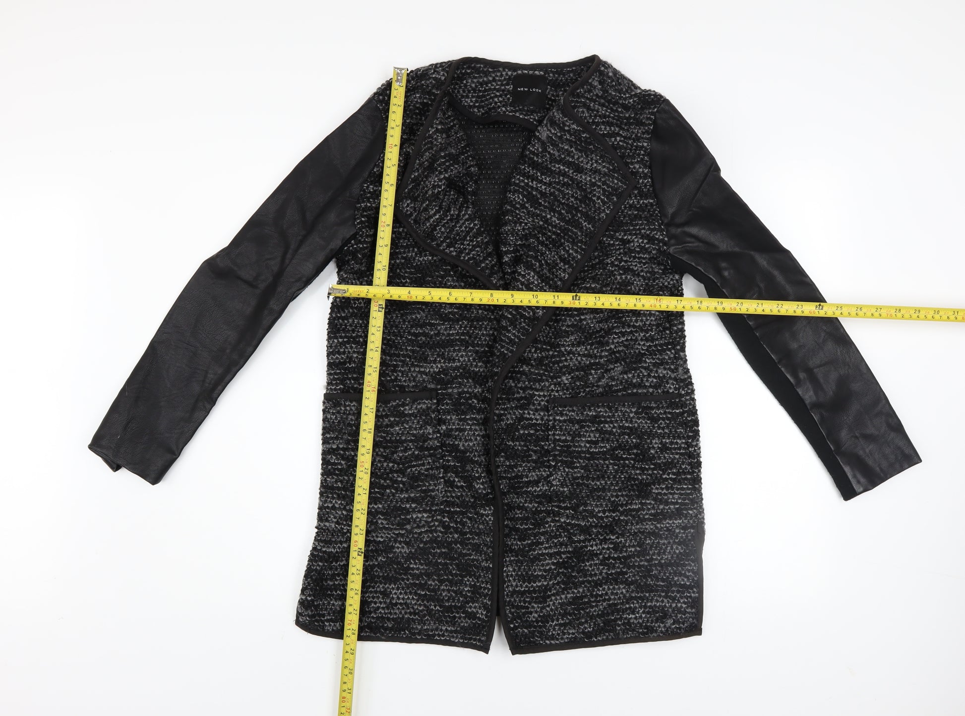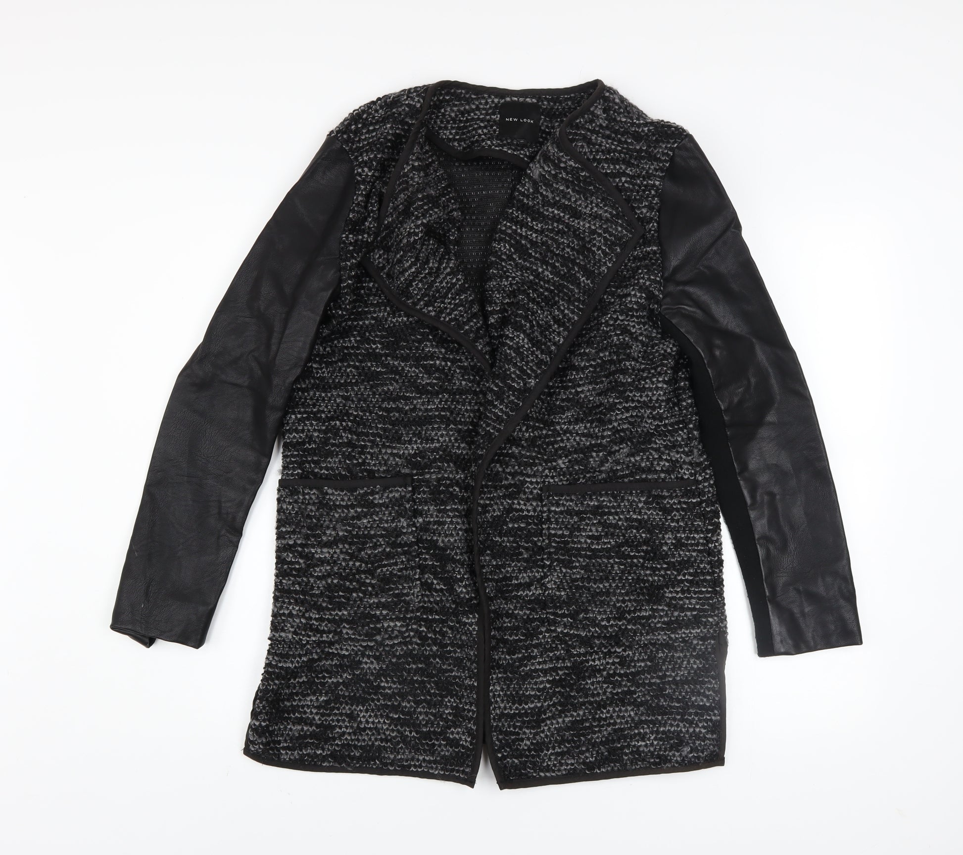 This stylish women’s coatigan from New Look offers the perfect blend of comfort and contemporary style. Designed in a versatile shade of grey, it features faux leather long sleeves combined with a soft knit body, creating a chic contrast that easily transitions from casual daywear to an evening out. The open front design and collared neckline lend a relaxed yet sophisticated appeal, while the two front pockets add practicality and finish the look with subtle detailing. Crafted from a durable blend of 88% polyester and 14% wool, this coatigan provides warmth and structure without feeling heavy, making it ideal for layering during the cooler months of autumn and winter. The inner lining is composed of a soft polyester and cotton mix, adding comfort and breathability for extended wear. Falling to a flattering mid-length, this piece pairs effortlessly with jeans, dresses, or tailored trousers for a polished outfit. Whether you're heading to brunch, the office, or an evening stroll, its look remains timeless and versatile. The condition is very good, showing only light signs of wear, particularly to the sleeves, but no major flaws. This makes it a fantastic pre-loved find that balances quality, fashion, and affordability. With a flattering regular fit and high-quality finish, this New Look coatigan captures casual sophistication at its best – refined, easy to wear, and effortlessly stylish, ensuring it becomes a firm favourite in your wardrobe.