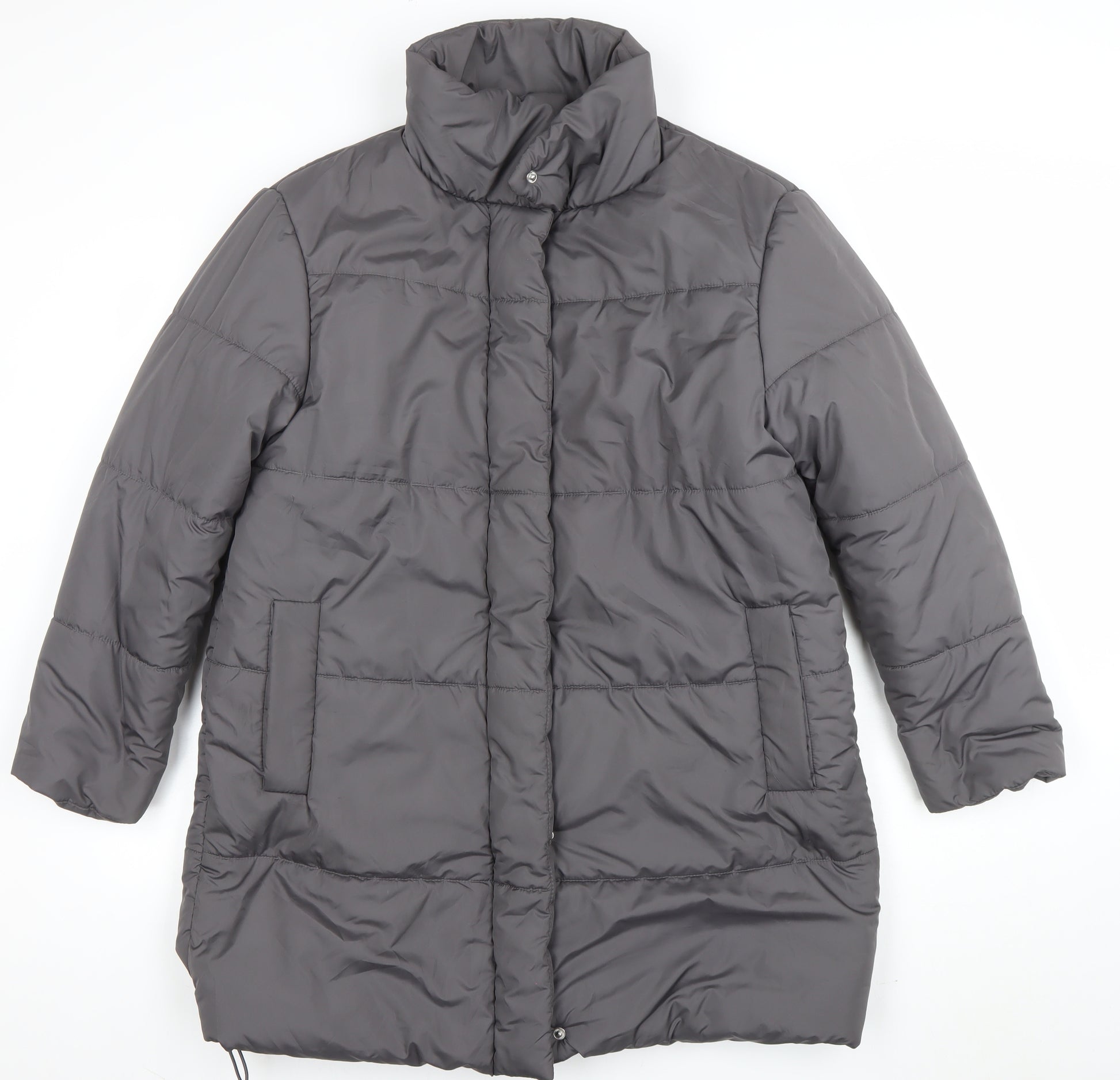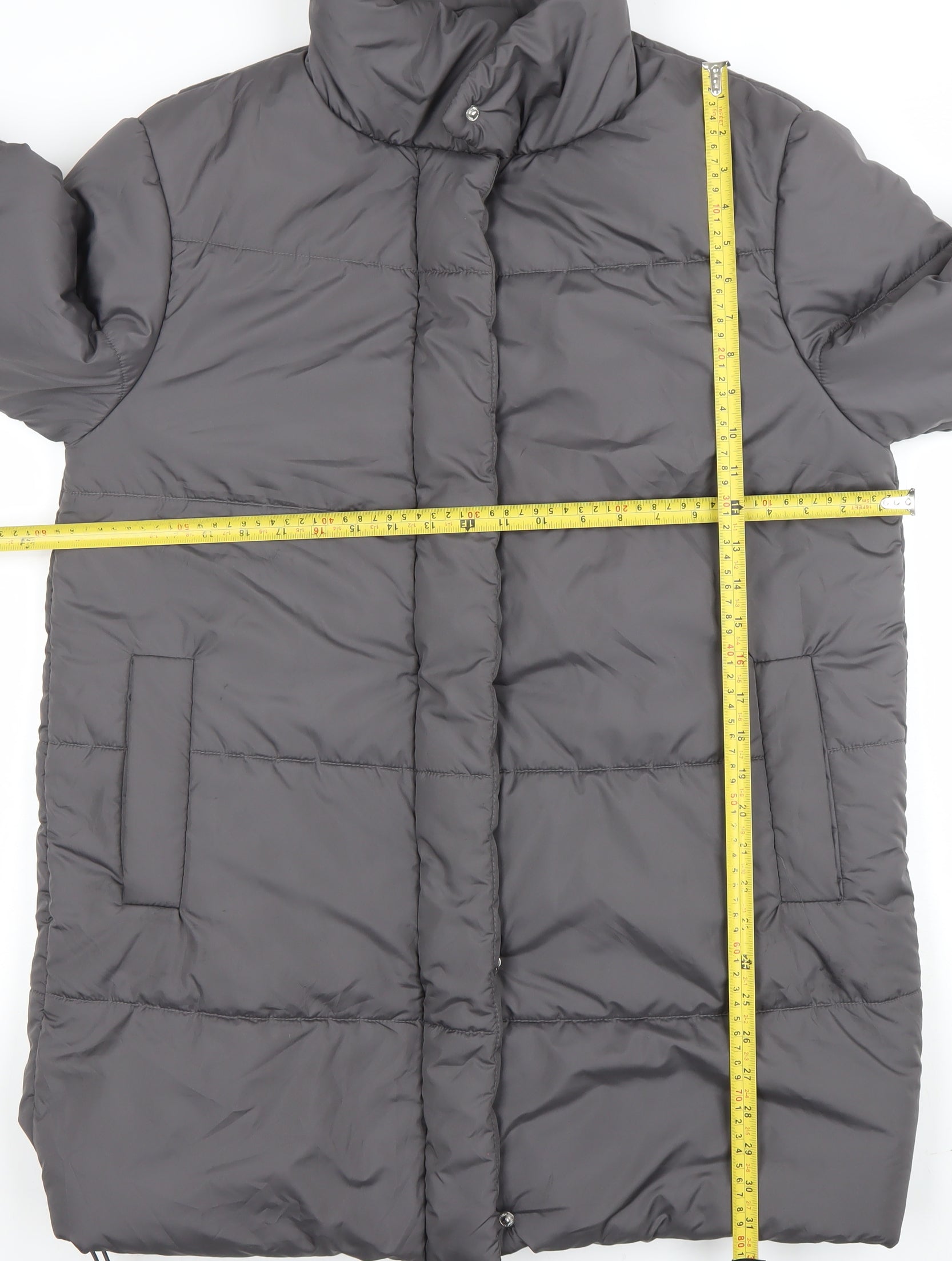 Stay warm and stylish this season with this New Look women’s grey puffer coat in size 10. Designed for both comfort and practicality, this long-length winter jacket delivers a classic padded silhouette ideal for colder months. The coat is constructed entirely from durable polyester, giving it a lightweight yet insulating feel. Soft quilting and a fully lined interior ensure excellent warmth retention without adding unnecessary bulk, while the smooth microfibre outer shell repels wind and light moisture. Finished in a versatile mid-grey tone, this jacket complements any casual winter outfit and pairs beautifully with jeans, knitwear or boots. The full zip front is covered by a popper-button storm flap for extra protection, while two front slip pockets offer convenient storage for essentials or to keep your hands warm. The high collar provides added coverage against chilly breezes, making it both practical and on-trend. It’s perfect for everyday wear, shopping trips, cold commutes, or weekend adventures outdoors. As part of New Look’s modern essentials range, this coat embodies casual sophistication while remaining highly functional. Its padded construction gives it a stylishly contemporary look, and the longline design provides additional warmth across the hips and thighs for a flattering finish. Made for the autumn and winter seasons, it is machine washable, allowing for easy care and lasting wear. This pre-owned piece is in excellent condition with minimal signs of light general wear, retaining its structure and comfort. With an estimated used value of £18.75, it represents a fantastic opportunity to add a cosy and chic jacket to your wardrobe for a fraction of the original price. Whether you’re braving frosty walks or layering up for city life, this New Look grey puffer coat will keep you comfortable and stylish all season long.