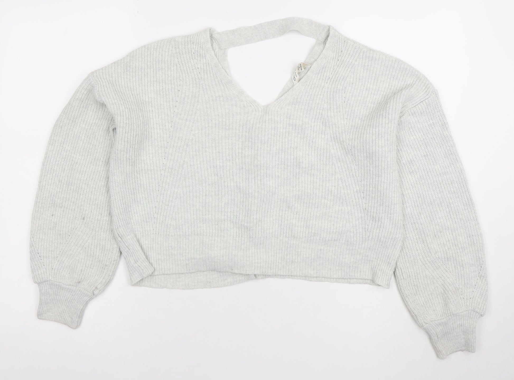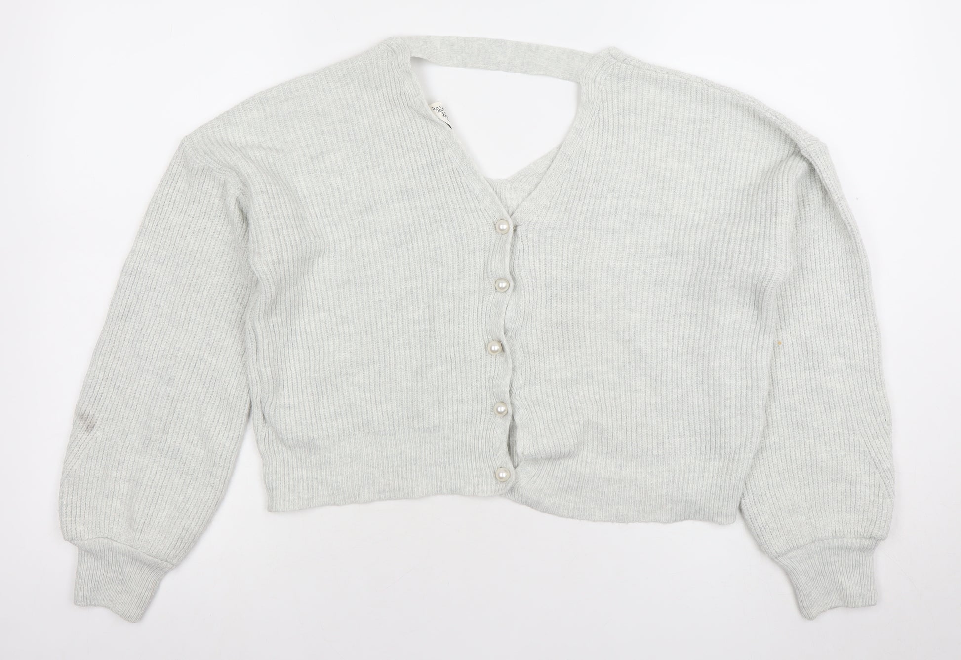 Stay cosy and effortlessly stylish with this lovely New Look women’s cardigan in soft grey. Designed in a classic rib-knit texture, this V-neck cardigan blends both comfort and chic simplicity—ideal for layering over your favourite dresses or pairing with jeans for an easy everyday look. The cardigan features a flattering V-neckline, long sleeves with ribbed cuffs, and elegant pearl-style buttons for a feminine touch. Crafted from a soft blend of acrylic, polyester, and elastane, it offers lightweight warmth with a comfortable stretch and maintains its shape well after washing.The neutral grey shade makes it incredibly versatile, perfect for mixing and matching across your wardrobe. Whether you’re heading to work, staying cosy at home, or meeting friends for coffee, this piece combines practicality with style. It’s machine washable and designed for effortless care, making it a wardrobe essential for the cooler autumn and winter months.Condition-wise, the cardigan is in very good pre-owned condition with just a small mark on one sleeve, which does not affect its wearability or overall appearance. The soft knit material feels snug yet lightweight, ensuring comfortable wear all day long. This New Look cardigan is ideal for women who appreciate modern classics with a timeless appeal and subtle detailing.If you love neutral tones and easy layering pieces, this cardigan will become your go-to option for adding warmth and elegance to any outfit. A versatile piece that looks great buttoned up for a neat look or open over a tee for a relaxed vibe—perfect for casual days.