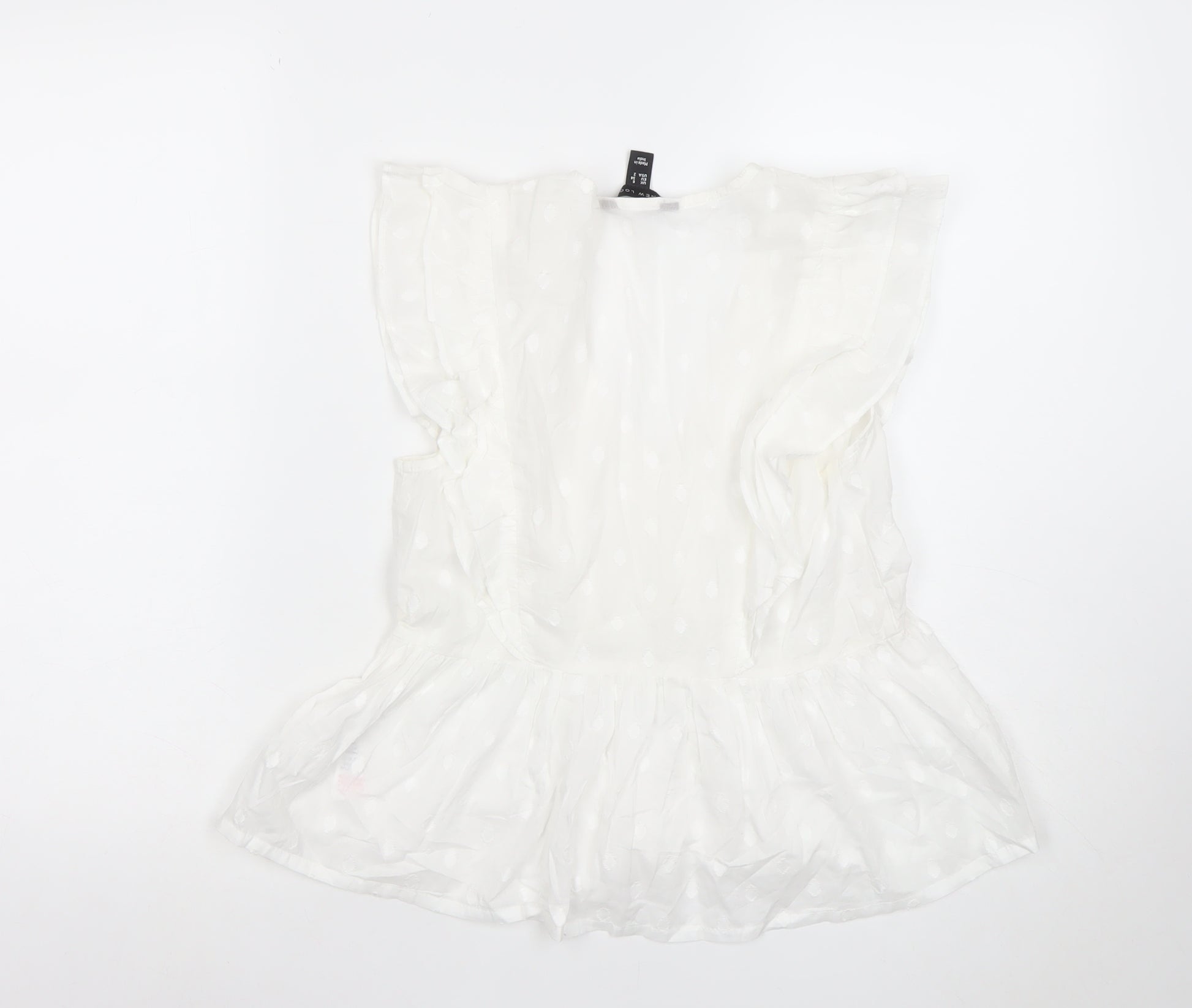 Elevate your everyday style with this elegant New Look women’s white ruffle blouse, perfect for both casual outings and special occasions. Crafted from lightweight chiffon with a soft, breathable texture, this charming piece combines a breezy feminine silhouette with a flattering V-neckline and flutter sleeves. The subtle polka dot pattern adds a hint of classic charm, while the delicate button front and gathered peplum-style waist offer a comfortable and stylish fit that accentuates your figure in all the right ways.Made entirely from premium polyester, this blouse provides an airy, flowing drape ideal for spring and summer wear. Whether paired with jeans for a laid-back yet polished day look or dressed up with a skirt and heels for an evening out, its versatility ensures it becomes a favourite wardrobe staple. The design embodies timeless elegance fused with modern detailing — the ruffled accents and soft sheen of the chiffon fabric give it that effortless sophistication that fits beautifully in both workwear and casual-chic settings.With its flattering regular fit and durable, machine-washable material, this New Look blouse offers both comfort and convenience, making it easy to care for while maintaining its fresh, refined appearance over time. In excellent pre-loved condition with minimal signs of wear, it’s an ideal choice for anyone seeking a stylish, feminine top at a great value.Perfect for warmer days, this blouse radiates understated grace. Its versatile white tone pairs effortlessly with all your wardrobe staples, making it a must-have piece for those who love soft, romantic fashion that stays timelessly chic season after season.
