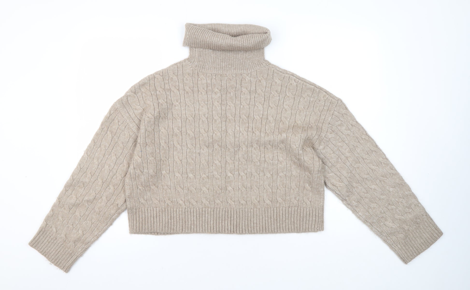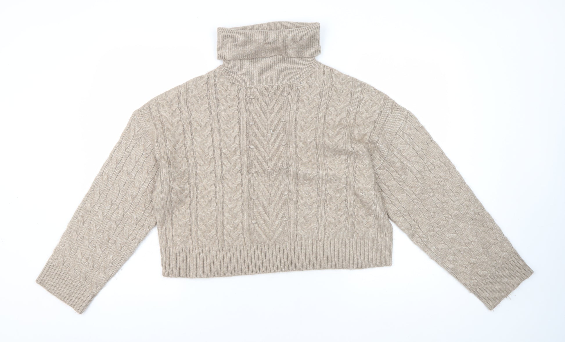 Discover the elegance of the New Look Women's Beige Roll Neck Pullover Jumper. Perfectly crafted for the Winter and Autumn seasons, this stylish piece offers a classic cable-knit pattern that exudes timeless charm. Made from a premium blend of 65% Acrylic and 35% Polyester, the jumper ensures warmth and comfort in colder months. Its roll neck design adds a touch of sophistication, making it an excellent choice for casual day outings or relaxed gatherings. The long sleeves provide additional coverage, while the regular fit ensures comfort without compromising style. Ideal for women seeking a versatile jumper, this knitted garment can be paired effortlessly with jeans for a relaxed look or elevated with a chic skirt for a more polished appearance. With its airy knit fabric, it’s a delightful addition to your wardrobe. The subtle beige colour complements a wide range of outfits, perfect for the fashion-forward individual. Upgrade your attire with this exquisite jumper from New Look, and step out in confidence and comfort.