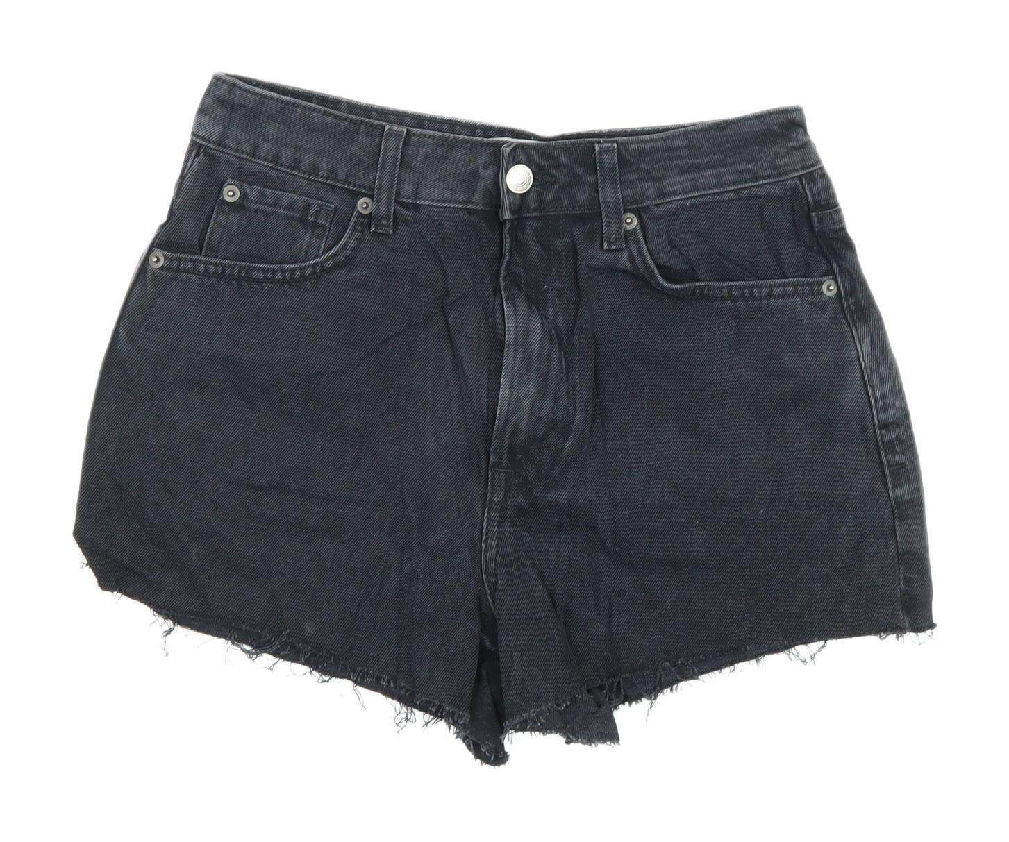 Elevate your casual wardrobe with these stylish New Look women's cut-off shorts. Crafted from 100% cotton, these black denim shorts offer comfort and breathability, making them ideal for summer and spring wear. The high-rise design flatters the silhouette while the regular fit ensures all-day comfort. Featuring a classic 5-pocket design, these shorts provide practicality and style. Accentuated with a button and zip closure, these cut-offs are as functional as they are fashionable. Perfect for a variety of casual occasions, these shorts can be paired effortlessly with your favourite tees and tops. Despite some minor fraying on the hems, these shorts are in excellent condition and ready to become a staple in your collection.