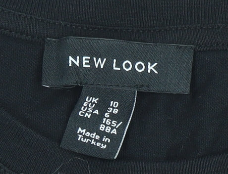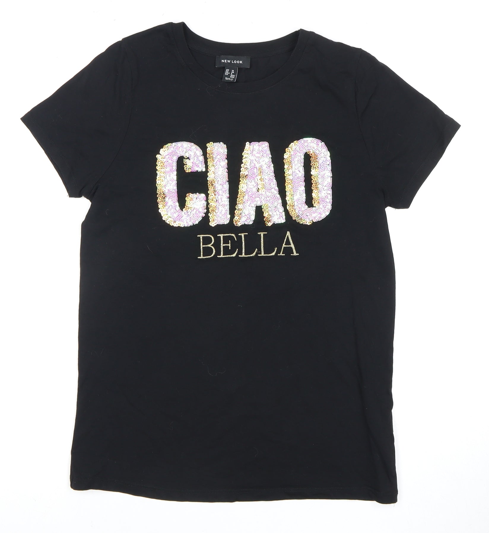 Elevate your casual wardrobe with this chic T-shirt from New Look, perfect for women seeking style and comfort. Crafted in a rich black hue, this stylish top features eye-catching 'CIAO BELLA' embroidery adorned with sequins, offering a unique touch to an everyday essential. Made with 100% cotton for ultimate breathability, the embroidery consists of a mix of polyamide and metallic fibre, ensuring a durable and elegant finish. The crew neck and short sleeves give it a classic silhouette, while the regular fit provides comfortable wear throughout the day. Designed for all seasons, this versatile T-shirt is easy to care for with machine washable fabric. Perfect for casual occasions, pair it with your favourite jeans or skirts for a trendy look. Attractively priced and in excellent used condition, this T-shirt by New Look promises to be a stylish addition to your collection.